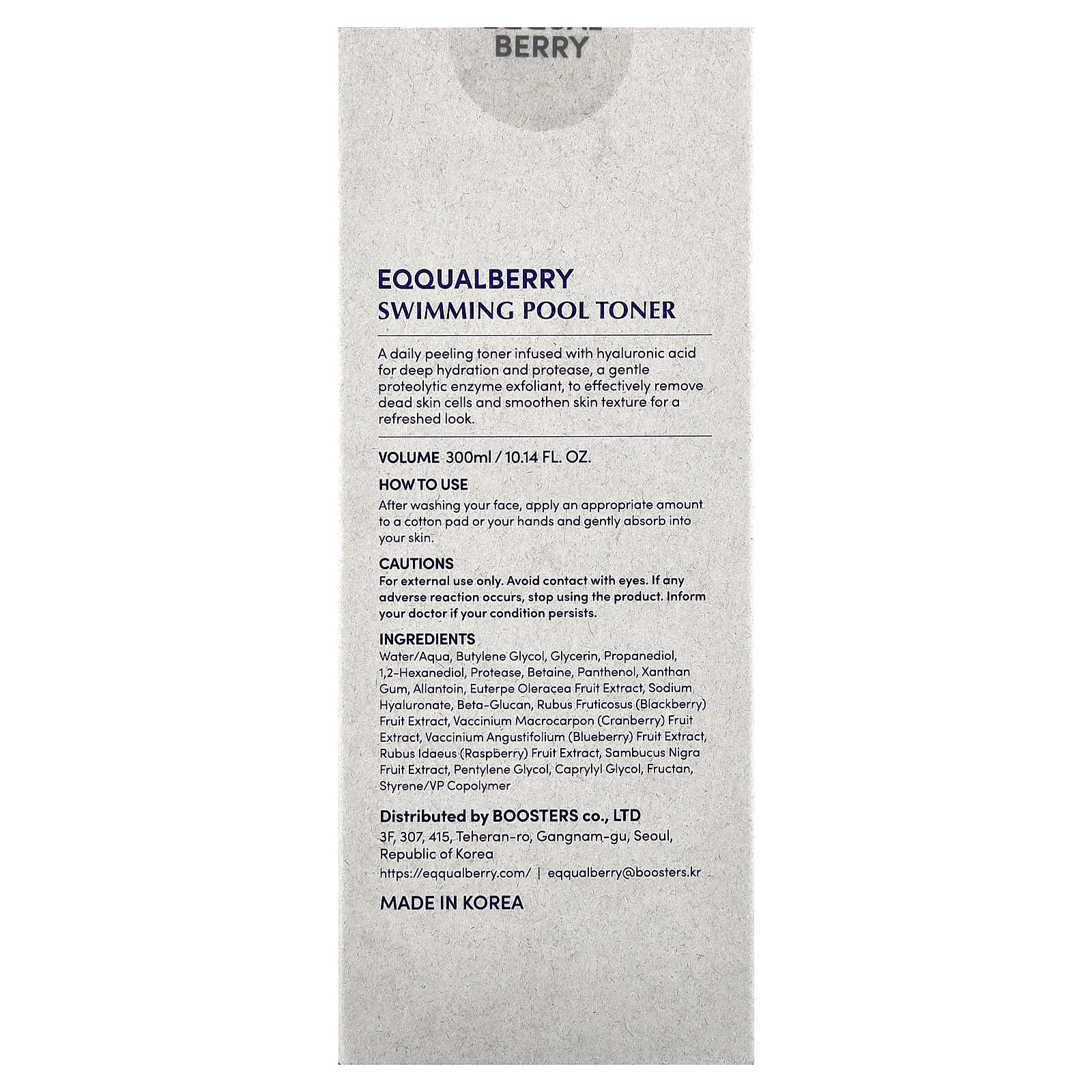 Вода, бутиленгликоль, глицерин, пропандиол, 1,2-гександиол, протеаза, бетаин, пантенол, ксантановая камедь, аллантоин, экстракт ягод асаи (Euterpe oleracea), гиалуронат натрия, бета-глюкан, экстракт ягод ежевики (Rubus fructicosus), экстракт ягод клюквы (Vaccinium macrocarpon), экстракт ягод голубики (Vaccinium angustifolium), экстракт ягод малины (Rubus idaeus), экстракт плодов черной бузины (Sambucus nigra), пентилен гликоль, каприлилгликоль, фруктан, стирол/ВП сополимер.
