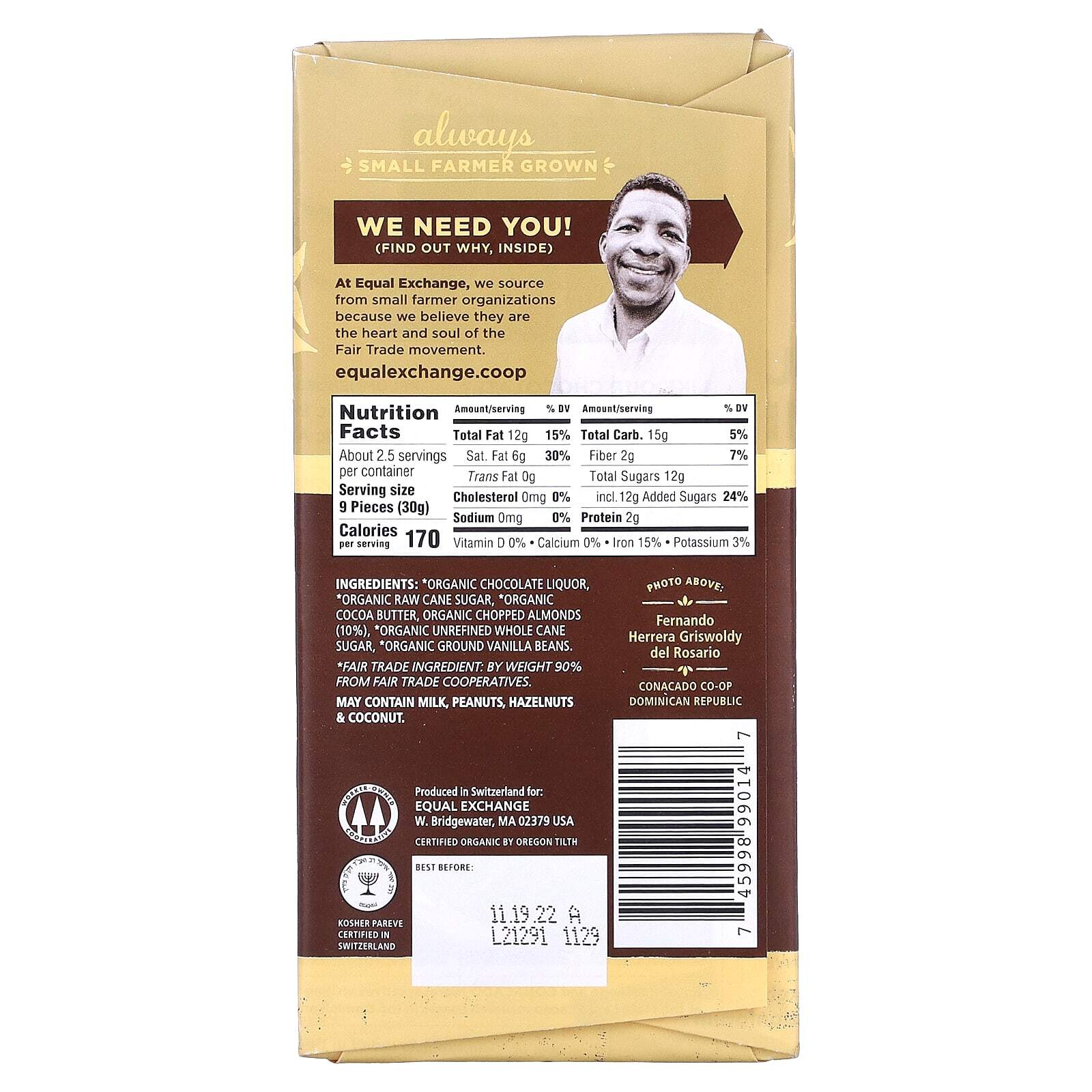 Органический шоколадный ликер*, органический сырой тростниковый сахар*, органическое какао-масло*, органический измельченный миндаль (10%)*, органический нерафинированный цельный тростниковый сахар*, органические молотые стручки ванили*.