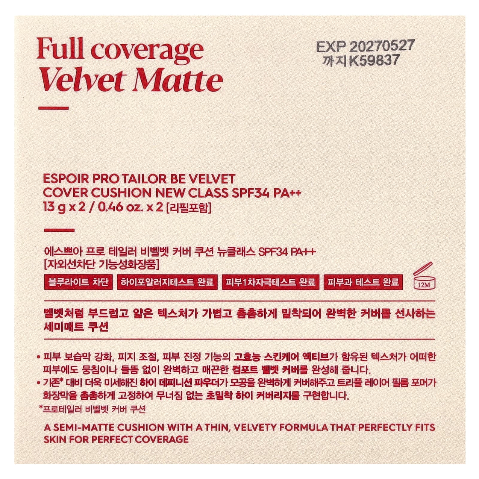 Espoir, Pro Tailor Be Velvet Cover Cushion New Class, SPF 34 PA ++, бежевый 23 шт., 2 шт., 13 г (0,46 унции)