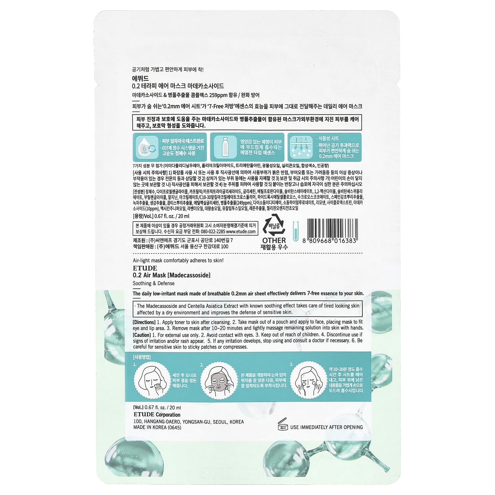 Ежедневная маска с низким уровнем раздражения, изготовленная из дышащей воздушной пленки толщиной 0,2 мм, эффективно доставляет на кожу эссенцию без 7 компонентов.