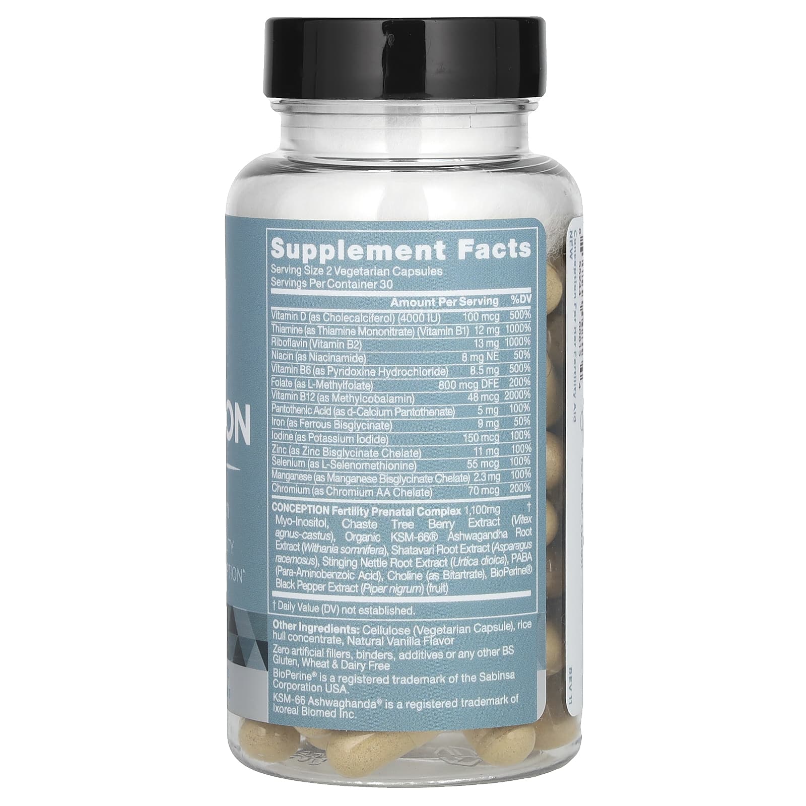 | CONCEPTION Fertility Prenatal Complex Мио-лнозитол, экстракт ягод витекса (Vitex agnus-castus), органический экстракт корня ашваганды (Withania somnifera) KSM-66®, экстракт корня шатавари (Asparagus racemosus), экстракт корня крапивы двудомной (Urtica dioica), парааминобен , Холин (в виде битартрата), экстракт черного перца BioPerine® (плоды) | 1,100 мг | † |