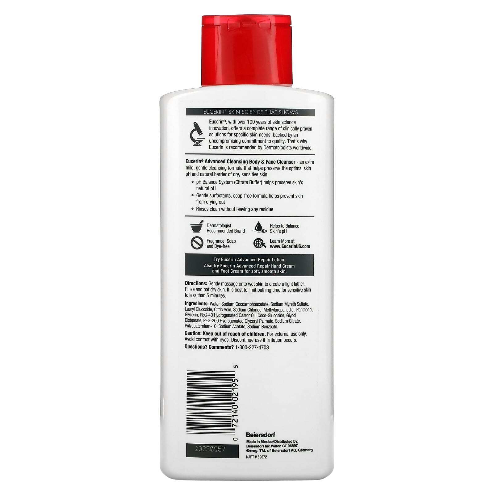 Очищающее средство для тела и лица Eucerin® Advanced — экстрамягкая, бережно очищающая формула, которая помогает сохранить оптимальный уровень pH кожи и природный барьер для сухой чувствительной кожи