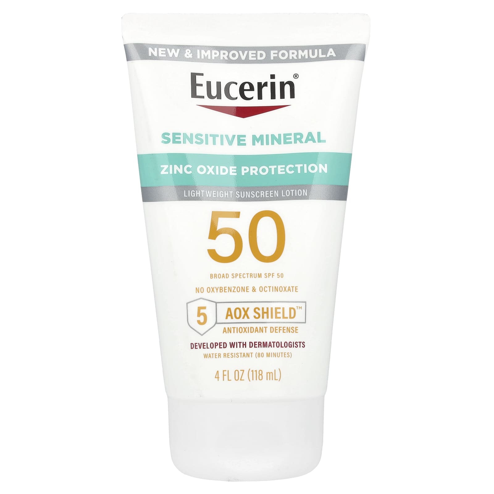 Минеральный солнцезащитный лосьон Eucerin Sun Sensitive - это легкий солнцезащитный крем, который легко наносится. Он обеспечивает широкий спектр защиты от солнца SPF 50 UVA / UVB со 100% защитой оксидом цинка * для нежной, не раздражающей кожи, устойчивой к воде и поту. Защита с помощью оксида цинка помогает защитить кожу, отражая и рассеивая UVA / UVB-лучи. * Компания Eucerin рекомендует бренд по уходу за кожей, основанный на бескомпромиссном научном подходе.