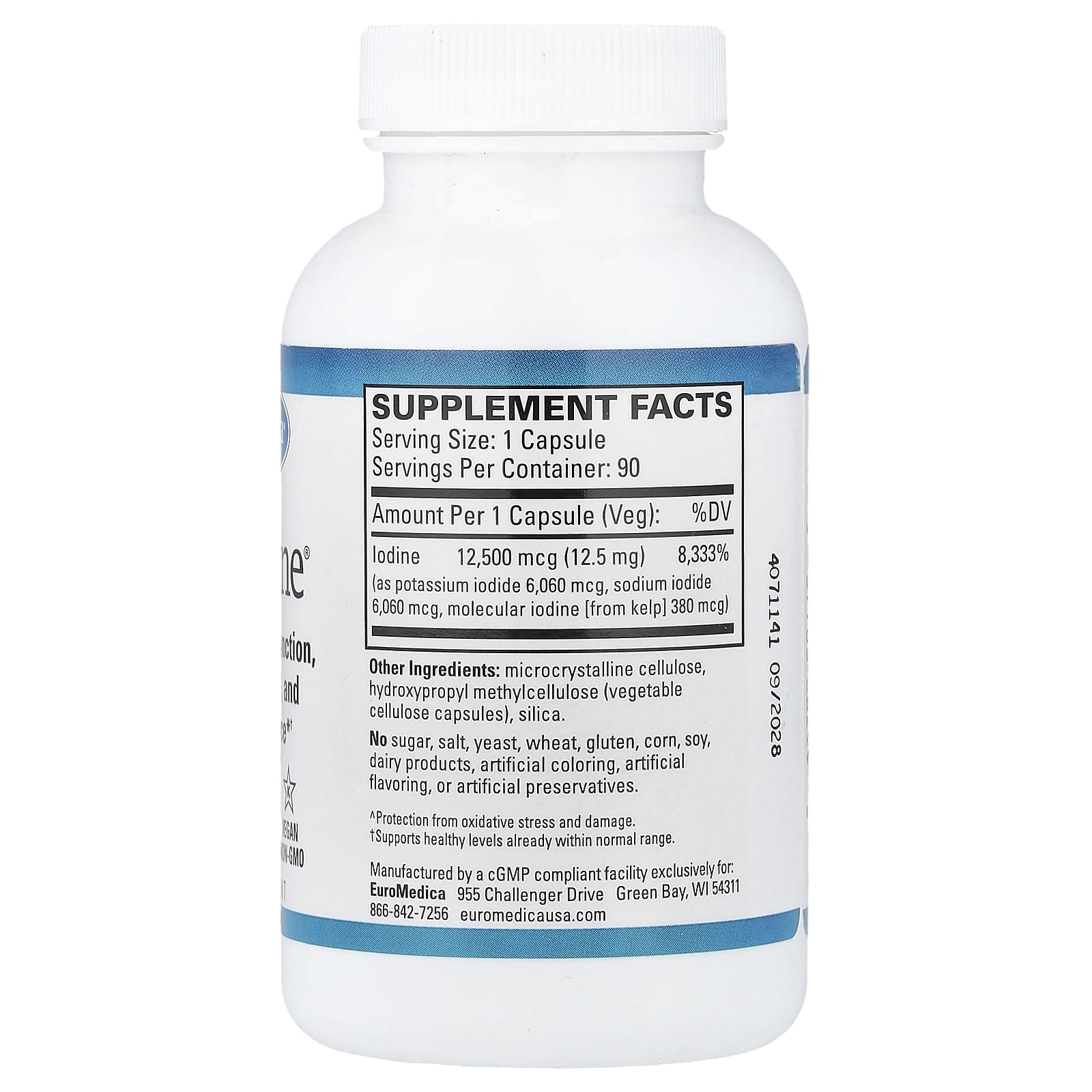 | йод (в виде йодида калия 6,060 мкг, йодида натрия 6060 мкг, молекулярного йода [из бурых водорослей] 380 мкг) | 12 500 мкг (12,5 мг) | 8333% |