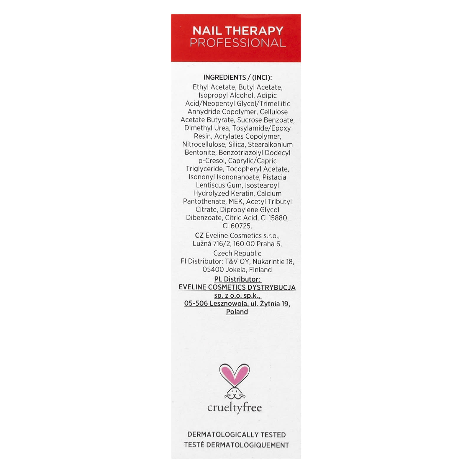 Этилацетат, бутилацетат, изопропиловый спирт, сополимер адипиновой кислоты / неопентилгликоля / тримеллитового ангидрида, бутират ацетата целлюлозы, бензоат сахарозы, диметилмочевина, тосиламид/эпоксидная смола, сополимер акрилатов, нитроцеллюлоза, диоксид кремния, стеаралкония бентонит, бензотриазолил додецил п-крезол, каприловый/каприновый триглицерид, токоферилацетат, изононил изононаноат, камедь фисташки (Fistacia lentiscus), изостеароил гидролизованный кератин, пантотенат кальция, Mek, ацетил трибутил цитрат, дипропиленгликоль дибензоат, лимонная кислота, CI 15880, CI 60725.