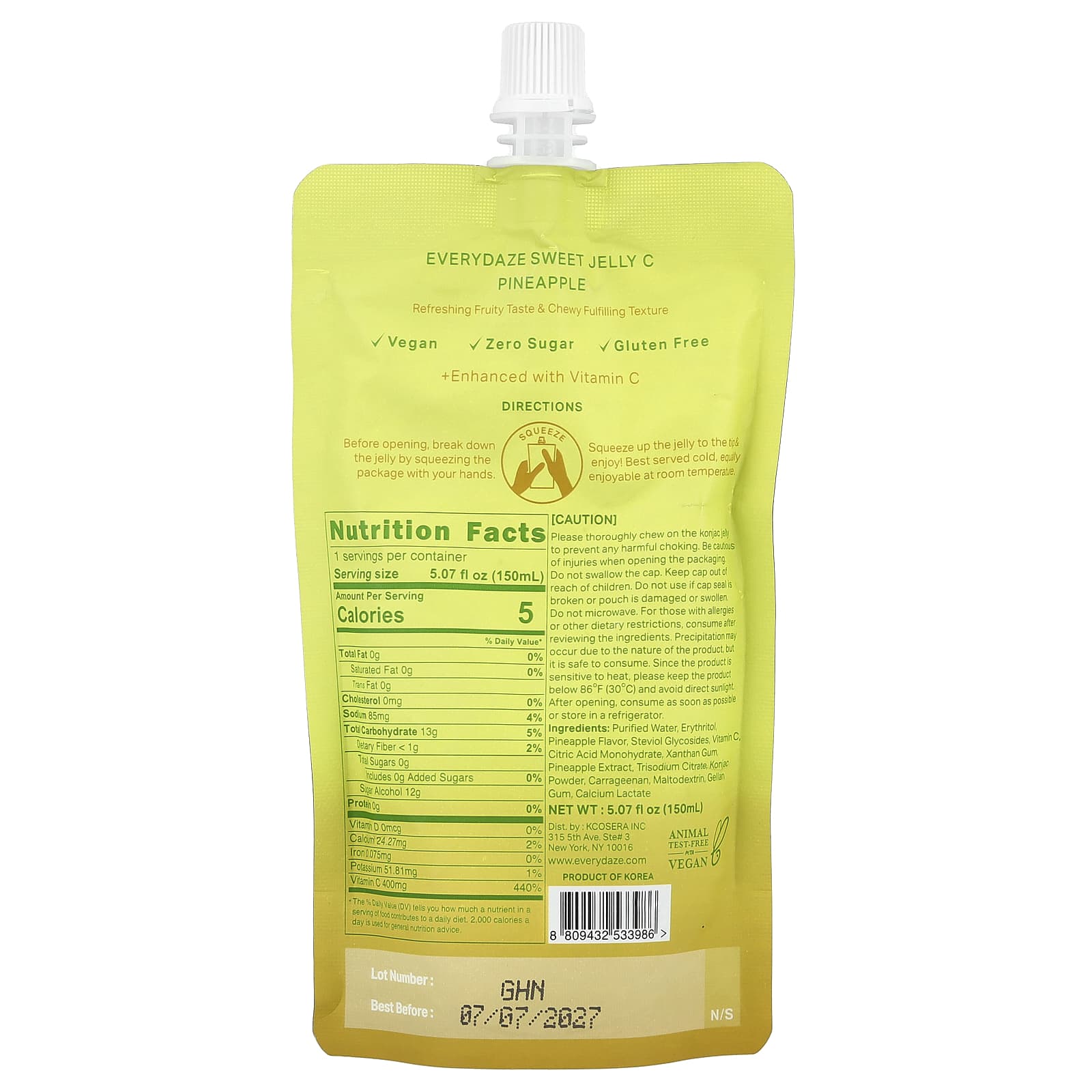 Пожалуйста, тщательно пережевывайте желе из конжака из-за опасности удушья. Открывая упаковку, будьте осторожны, чтобы не получить травму. Не глотать колпачок. Держите колпачок от упаковки в недоступном для детей месте. Не используйте, если защитная пленка повреждена или пакет поврежден. Не разогревать в микроволновой печи. Для людей, страдающих аллергией или другими диетическими ограничениями, употреблять после ознакомления с ингредиентами. Из-за характера продукта могут выпадать осадки, но он безопасен для употребления. Поскольку продукт чувствителен к нагреванию, храните его при температуре ниже 30 ºС (86 ºF) и избегайте попадания прямых солнечных лучей. После вскрытия употребить как можно скорее или хранить в холодильнике.