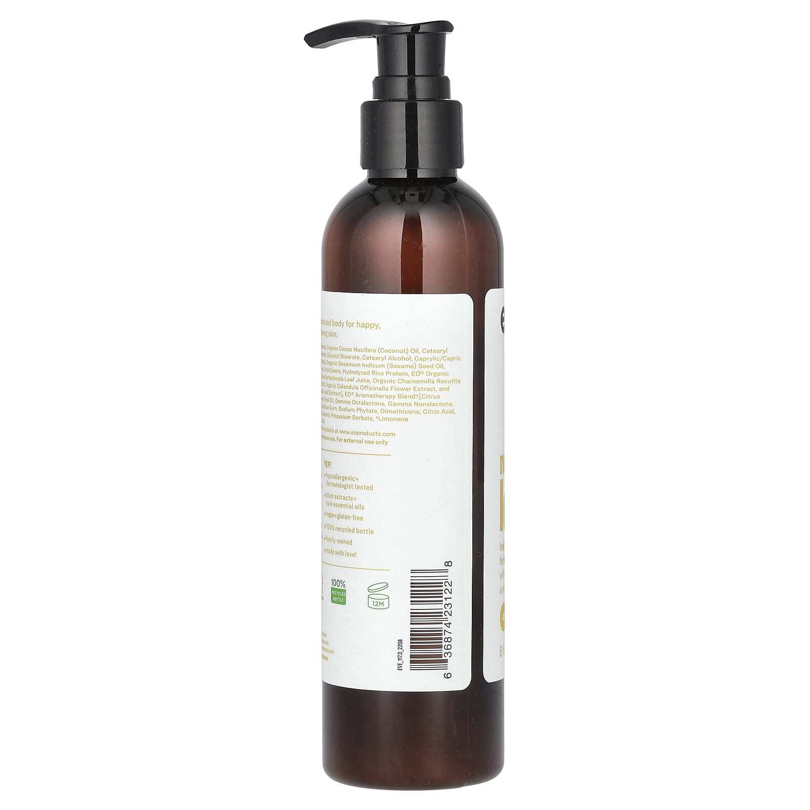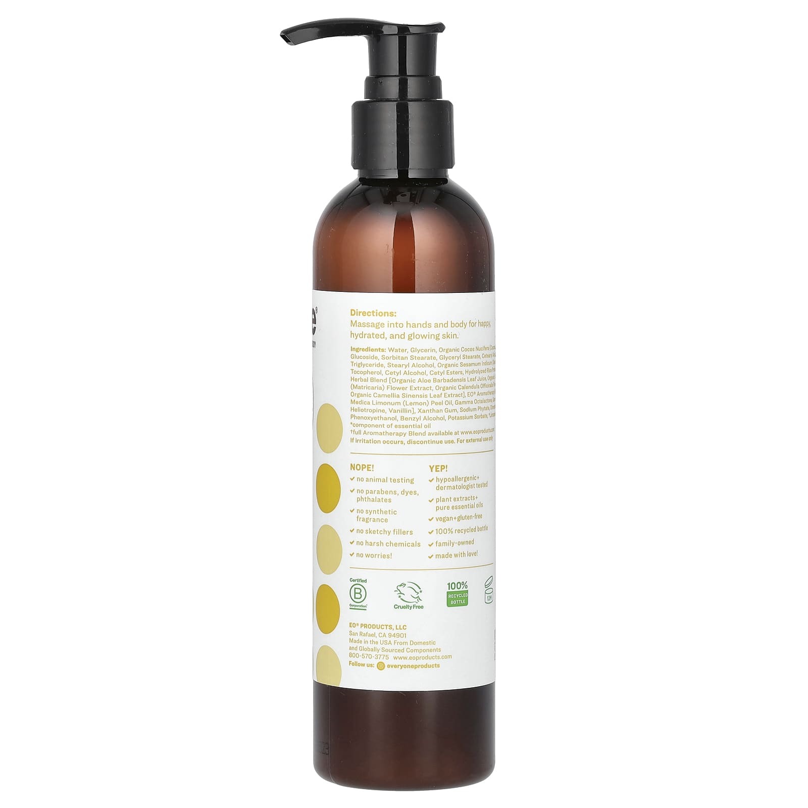 Вода, глицерин, органическое кокосовое масло (Cocos nucifera), цетеарил глюкозид, сорбитан стеарат, глицерил стеарат, цетеариловый спирт, каприловый / каприновый триглицерид, стеариловый спирт, органическое кунжутное масло (Sesamum indicum), токоферол, цетиловый спирт, цетиловые эфиры, гидролизованный рисовый белок, органическая травяная смесь eo® [сок листьев органического алоэ вера, органический экстракт цветков ромашки (Chamomilla recutita), органический экстракт цветков календулы лекарственной, органический экстракт листьев камелии китайской], смесь для ароматерапии eo® [масло из цедры лимона, этанол, гамма-окталактон, гамма-ноналактон, гелиотропин, ванилин], ксантановая камедь, фитат натрия, диметикон, лимонная кислота, феноксиэтанол, бензиловый спирт, сорбат калия, * лимонен.