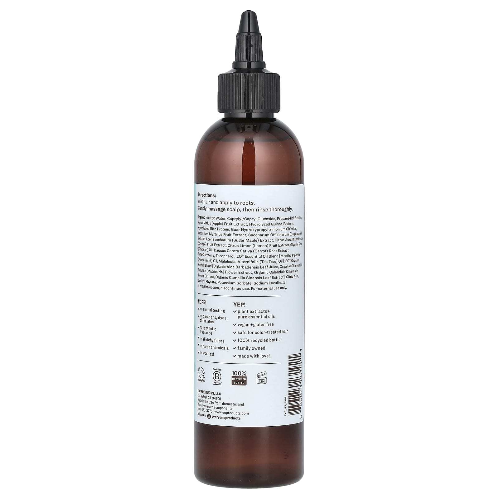 Вода, каприлил / каприл глюкозид, пропандиол, бетаин, экстракт плодов яблока (Pyrus malus), гидролизованный белок киноа, гидролизованный рисовый белок, гуар гидроксипропилтримония хлорид, экстракт плодов Vaccinium myrtillus, экстракт сахарного тростника (Saccharum officinarum), экстракт сахарного клена (Acer saccharum), экстракт плодов апельсина (Citrus aurantium dulcis), экстракт плодов лимона (Citrus limon), соевое масло (глицин), экстракт корня моркови (Daucus carota sativa), бета-каротин, токоферол, смесь эфирных масел eo® [масло перечной мяты (Mentha piperita), масло чайного дерева (Maleleuca alternifolia)], органическая травяная смесь eo® [сок листьев органического алоэ вера, органический экстракт цветков ромашки (Chamomilla recutita), органический экстракт цветков календулы лекарственной, органический экстракт листьев камелии китайской], лимонная кислота, фитат натрия, сорбат калия, левулинат натрия.
