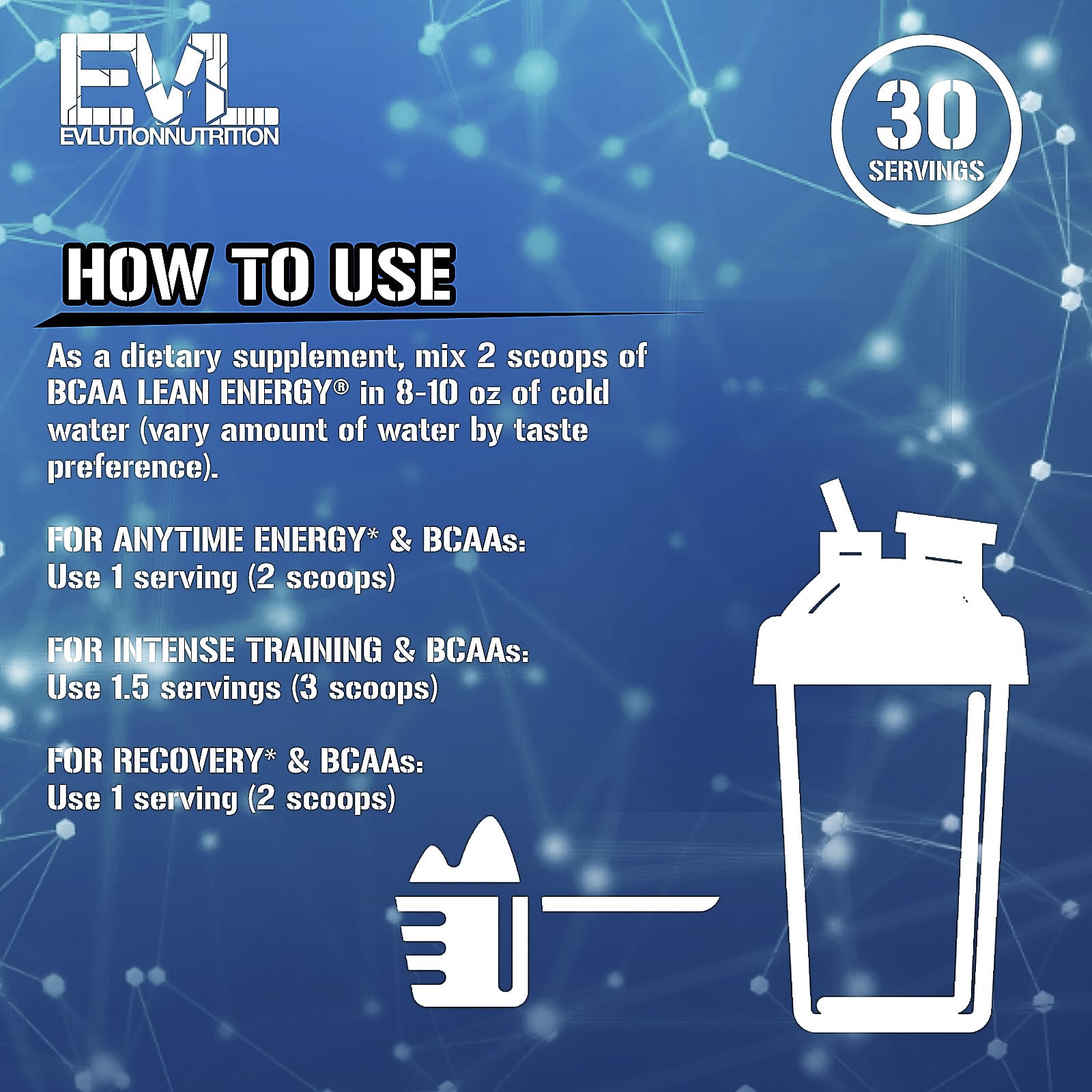 В качестве пищевой добавки смешайте 2 мерные ложки BCAA Lean Energy® с 240–240 мл (8–10 унциями) холодной воды (количество воды можно варьировать по вкусовым предпочтениям).