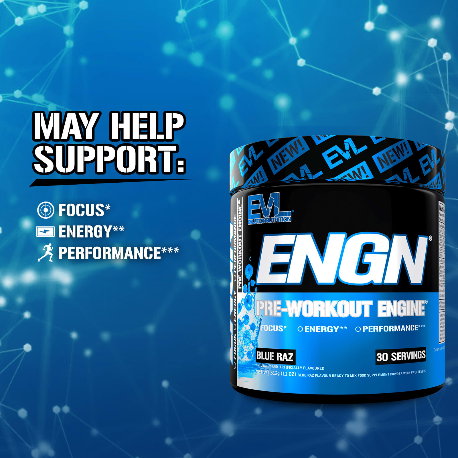 Моногидрат креатина, бета-аланин, безводный бетаин, регуляторы кислотности (лимонная кислота, яблочная кислота и карбонат кальция), вещества, препятствующие слеживанию (диоксид кремния и силикат кальция), натуральные и искусственные ароматизаторы, битартрат холина, безводный кофеин, подсластители (сукралоза и ацесульфам калия), н-ацетил L-тирозин, ниацинамид (никотинамид), фолиевая кислота, экстракт листьев оливкового дерева (40% олеуропеина), витамин B1 (мононитрат тиамина), цвет (ярко-синий), витамин B12 (цианокобаламин), витамин B6 (пиридоксина гидрохлорид).
