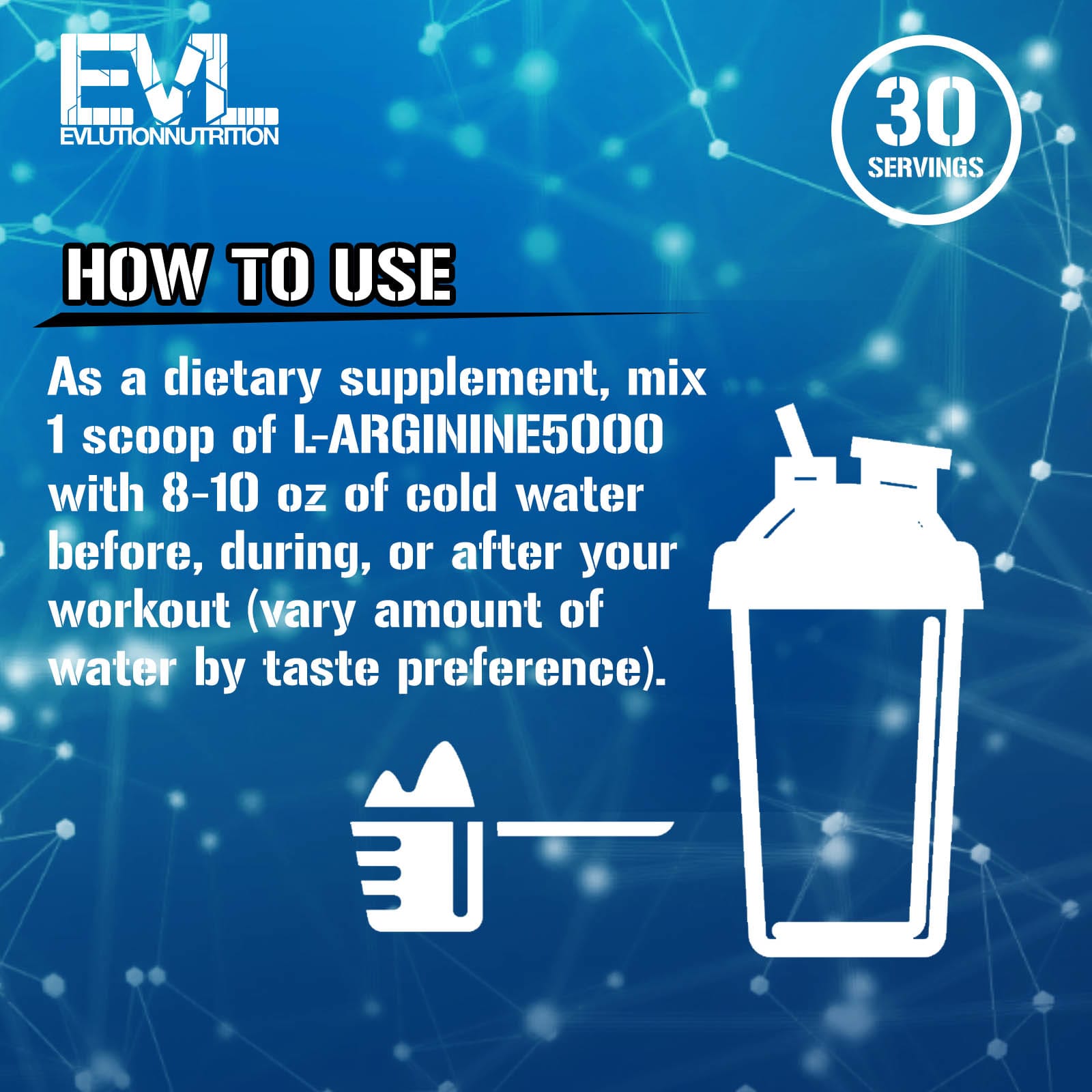 В качестве пищевой добавки смешайте 1 мерную ложку L-ARGININE5000 с 240–300 мл (8–10 унциями) холодной воды до, во время или после тренировки (регулируйте количество воды по вкусу).