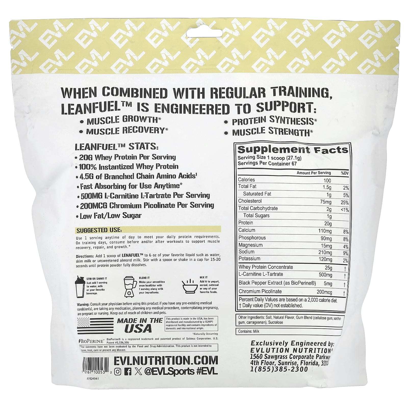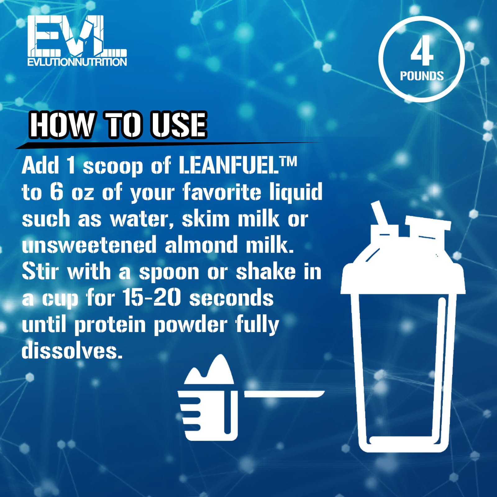 Добавьте 1 мерную ложку LeanFuel ™ в 180 мл (6 унций) вашей любимой жидкости, например воды, обезжиренного молока или несладкого миндального молока. Размешайте ложкой или взбейте в чашке в течение 15–20 секунд до полного растворения протеинового порошка.