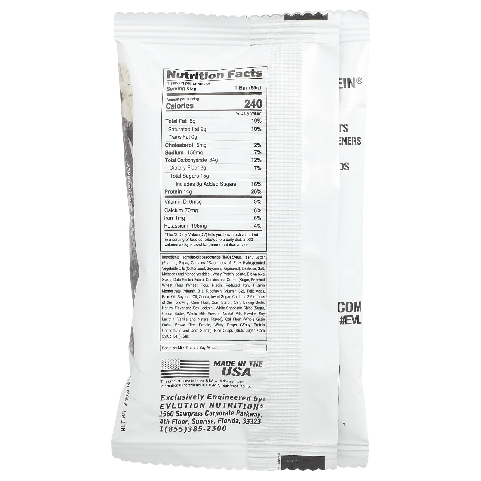 Сироп с о-олигосахаридом (ИМО), арахисовая паста (арахис, сахара, содержит менее 2%: полностью гидрогенизированных растительных масел (хлопковое, соя, рапс), декстроза, соль, патока и моноглицериды), изолят сывороточного протеина, сироп из бурого риса, финиковая паста (финики), печенье и крем (сахар, обогащенная пшеничная мука (пшеничная мука, ниацин, восстановленное железо, мононитрат тиамина (витамин B1), рибофлавин (витамин B2), фолиевая кислота), пальмовое масло, соевое масло, какао, инвертный сахар, содержит не более 2% следующих ингредиентов: мука из кукурузы, кукурузный крахмал, соль, пищевая сода, натуральный ароматизатор и соевый лецитин), крошка из белого шоколада (сахар, какао-масло, сухое цельное молоко, сухое обезжиренное молоко, соевый лецитин, ваниль и натуральный ароматизатор), овсяная мука (цельнозерновой овес), протеин из коричневого риса, чипсы (концентрат сывороточного протеина и кукурузный крахмал), рисовые чипсы (рис, сахара, кукурузный сироп, соль), соль.