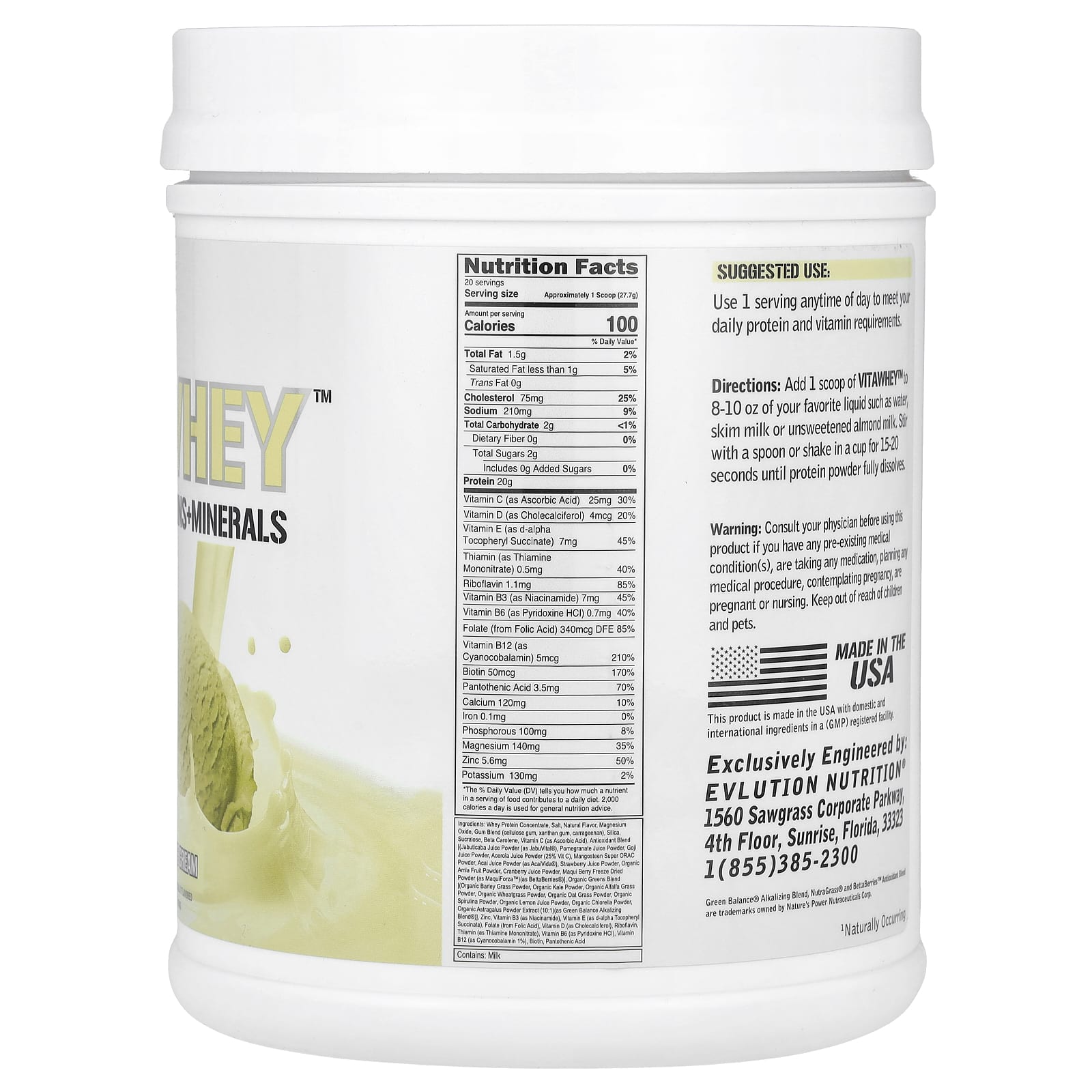 Концентрат сывороточного протеина, соль, натуральный ароматизатор, оксид магния, смесь камеди (целлюлозная камедь, ксантановая камедь, каррагинан), диоксид кремния, сукралоза, бета-каротин, витамин С (в виде аскорбиновой кислоты), смесь антиоксидантов [(порошок сока жабутикаба (в виде джабувитала), порошок из гранатового сока, порошок из сока годжи, порошок сока ацеролы (25% витамина С), порошок из мангостина, порошок сока асаи (asaivida®), порошок из клубничного сока, органический порошок из плодов амлы, порошок из клюквенного сока, лиофилизированный порошок из ягод маки (в виде maquiforza ™) (в виде Bettaberries®), органическая смесь зелени [(порошок из органических ячменя, органический порошок из капусты, порошок из органической люцерны, органический порошок ростков пшеницы, органический порошок из овсяных трав, органический порошок из спирулины, порошок из сока органического лимона, органический порошок хлореллы, подщелачивающая смесь green balance®, смесь антиоксидантов Nutragrass® и bettaberries ™)], цинк, витамин B3 (в виде ниацинамида), витамин E (в виде d-альфа токоферил сукцината), фолиевая кислота (из фолиевой кислоты), витамин D (в виде холекальциферола), рибофлавин, тиамин (в виде мононитрата тиамина), витамин B6 (в виде пиридоксина гидрохлорида), витамин B12 (в виде цианокобаламина 1%), биотин, пантотеновая кислота.