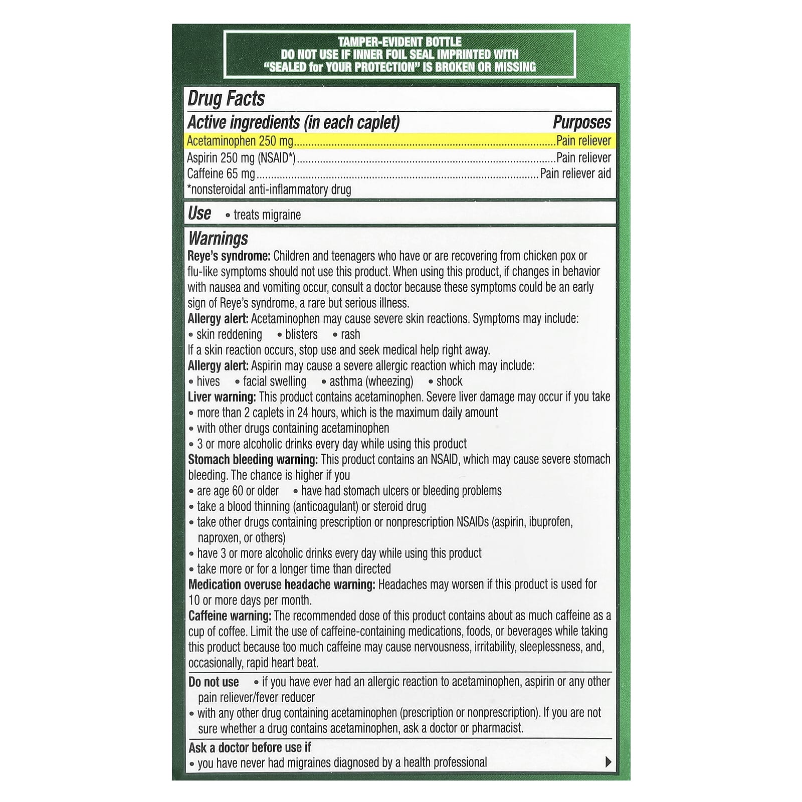 - 250 мг ацетаминофена, 250 мг аспирина (НПВП) и 65 мг кофеина