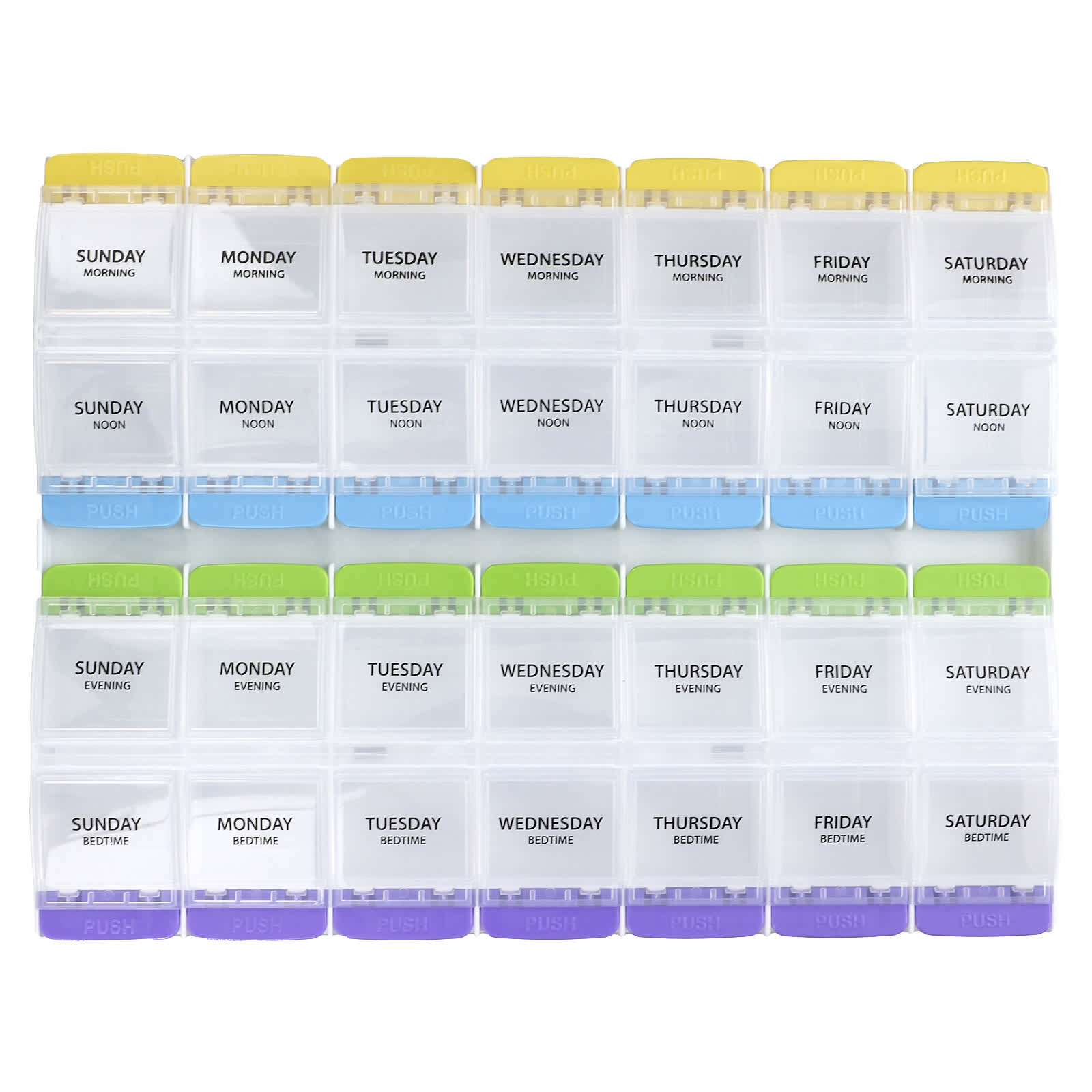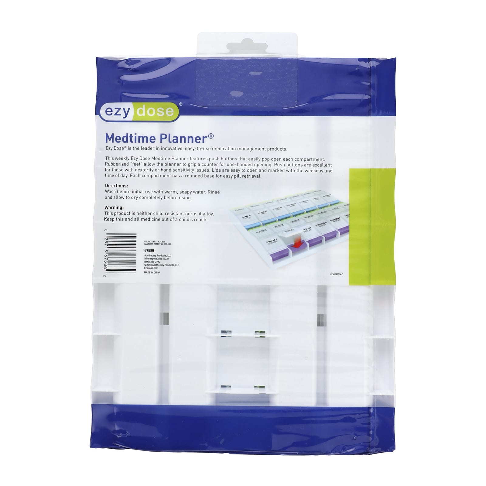 Каждое отделение этого еженедельного ежедневника Ezy Dose Medtime-Ежедневника имеет кнопки, которые легко открываются. Прорезиненные «ножки» позволяют планнеру захватывать прилавок одной рукой и открывать его. Кнопки отлично подходят для людей с проблемами с подвижностью или чувствительностью рук. Крышка легко открывать, на них нанесены день недели и время суток. Каждое отделение имеет закругленное дно для легкого извлечения таблеток.