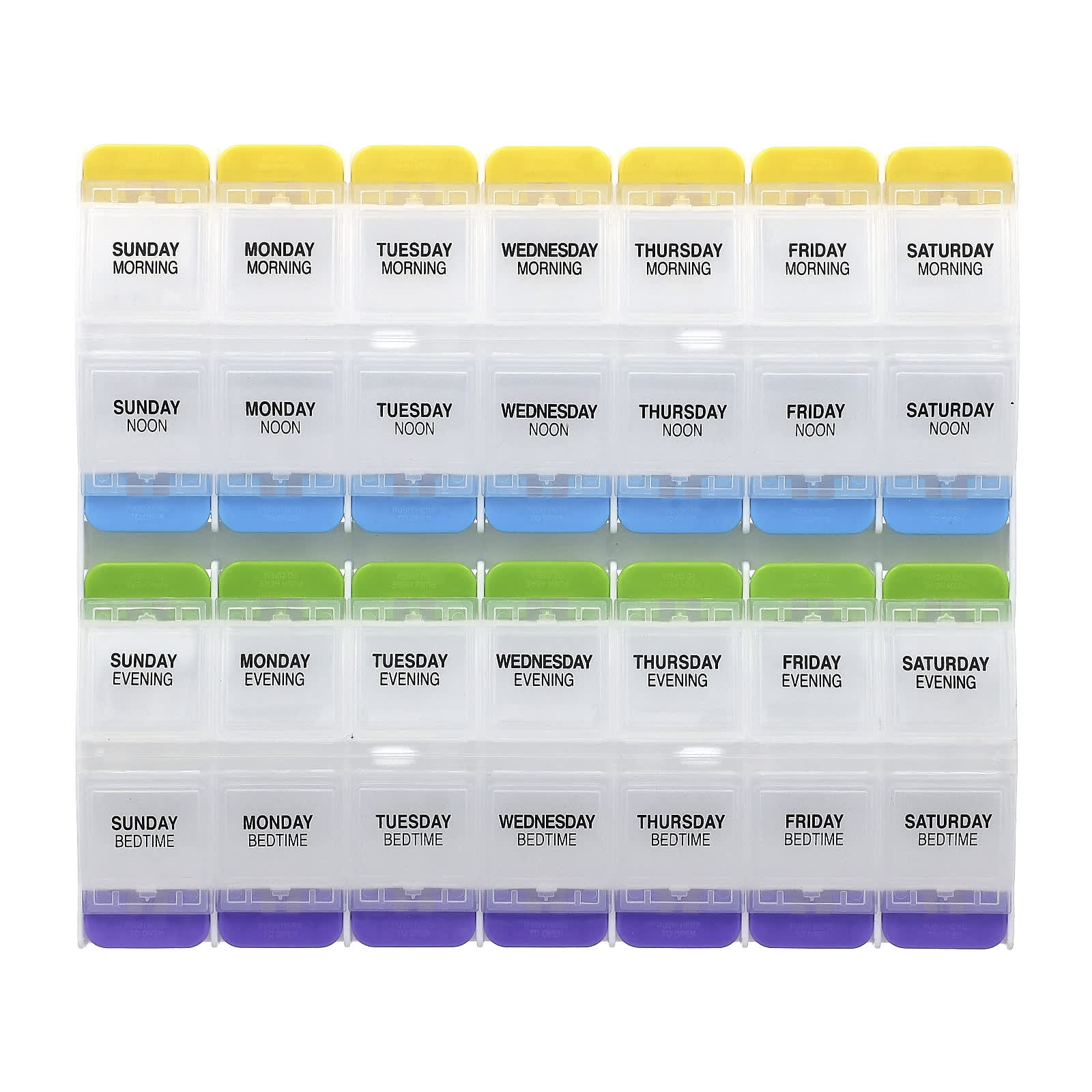 Каждое отделение этого еженедельного ежедневника Ezy Dose Medtime-Ежедневника имеет кнопки, которые легко открываются. Прорезиненные «ножки» позволяют планнеру захватывать прилавок одной рукой и открывать его. Кнопки отлично подходят для людей с проблемами с подвижностью или чувствительностью рук. Крышка легко открывать, на них нанесены день недели и время суток. Каждое отделение имеет закругленное дно для легкого извлечения таблеток.