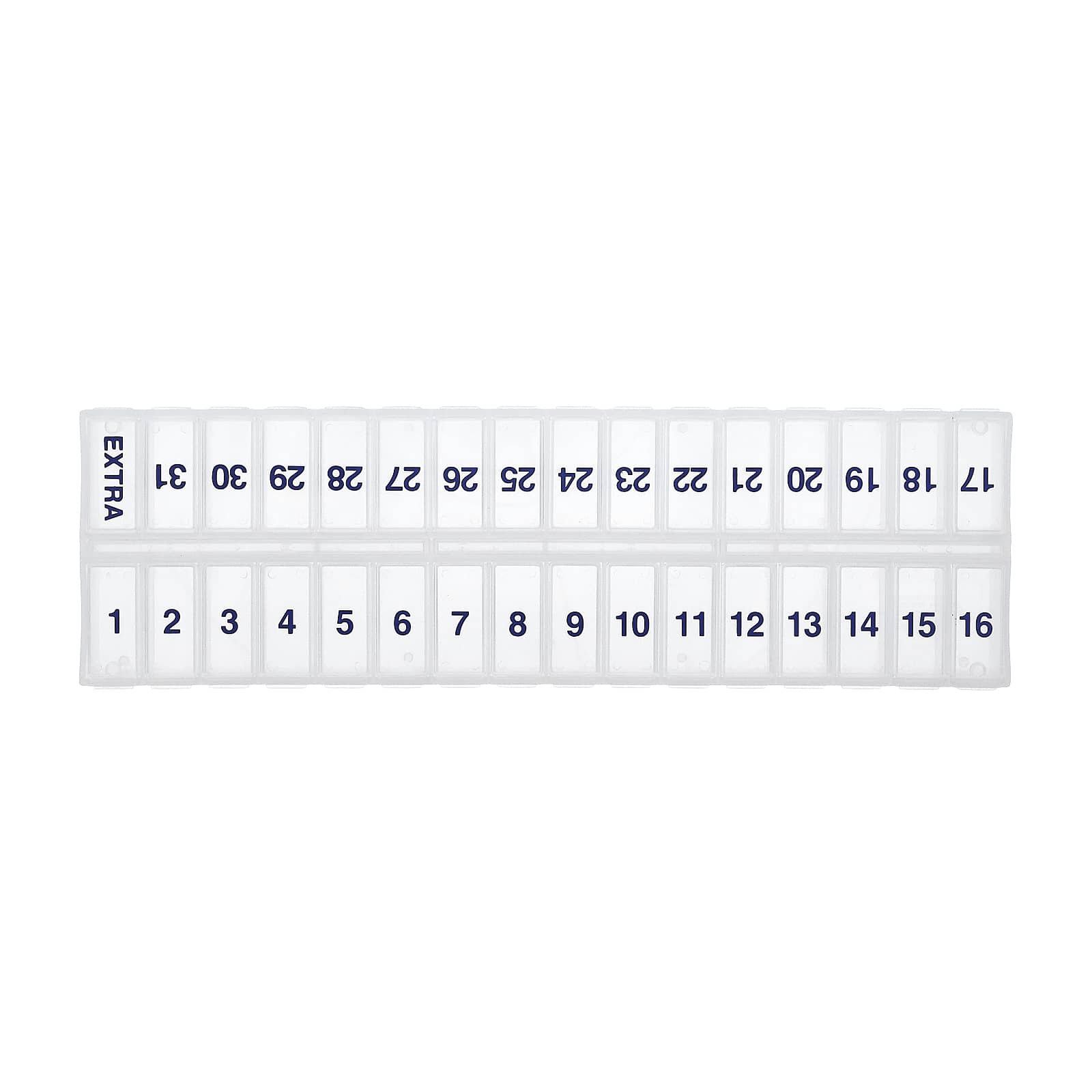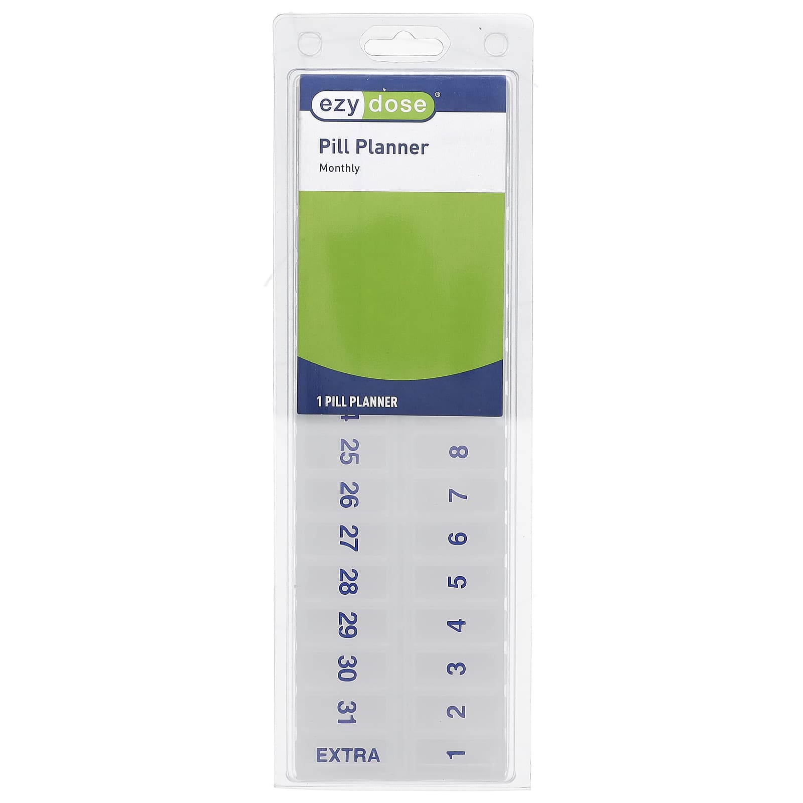 В этом ежемесячном органайзере для приема таблеток Ezy Dose есть отделения, помеченные днями 1–31, и дополнительное отделение для дополнительной дозы. Это позволяет легко отсчитывать оставшиеся дни до приема ежемесячных препаратов и сопоставлять каждую дозу с определенным днем.
