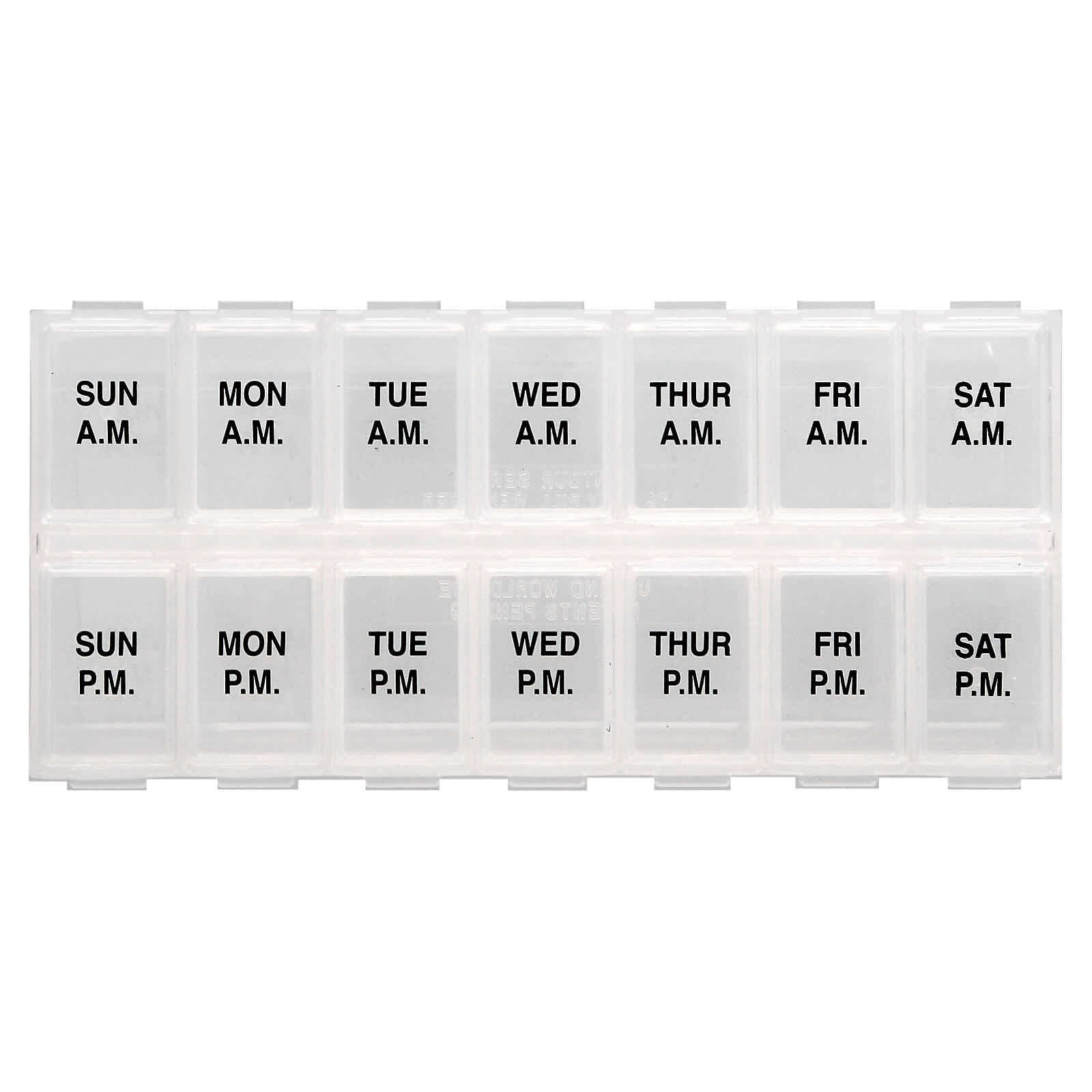 Этот еженедельный органайзер для таблеток Ezy Dose имеет закругленное основание в каждом отделении для удобного извлечения таблеток. Прозрачный пластик позволяет легко увидеть, были ли приемы лекарств или витаминов. На каждом легкодоступном отделении указаны день недели и время суток.