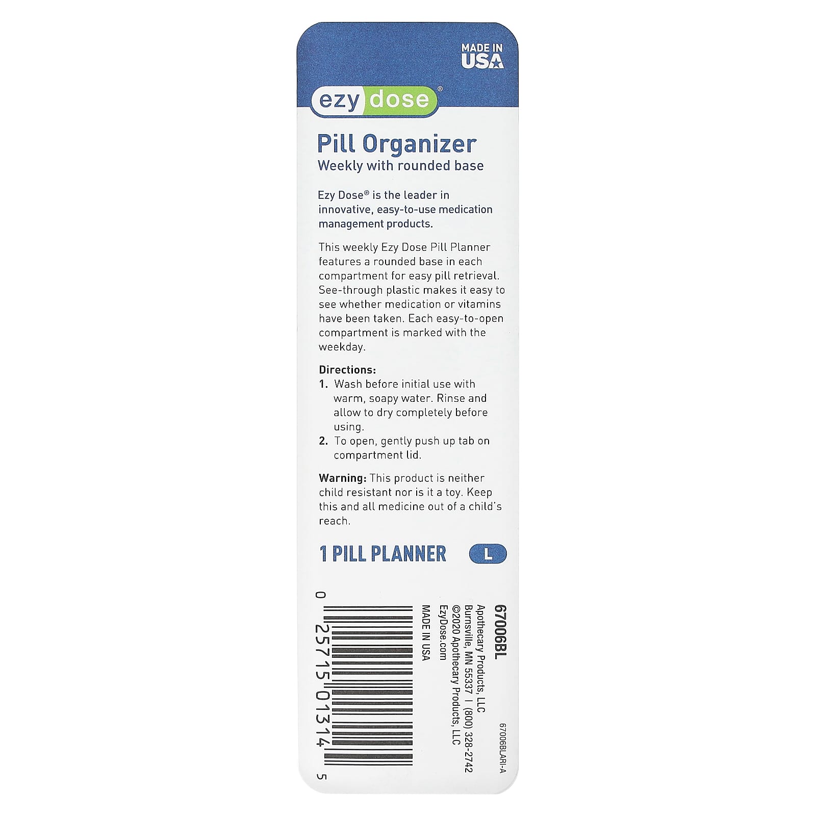 Этот еженедельный органайзер для таблеток Ezy Dose имеет закругленное основание в каждом отделении для удобного извлечения таблеток. Прозрачный пластик позволяет легко увидеть, были ли приемы лекарств или витаминов. На каждом легкодоступном отделении указан день недели.