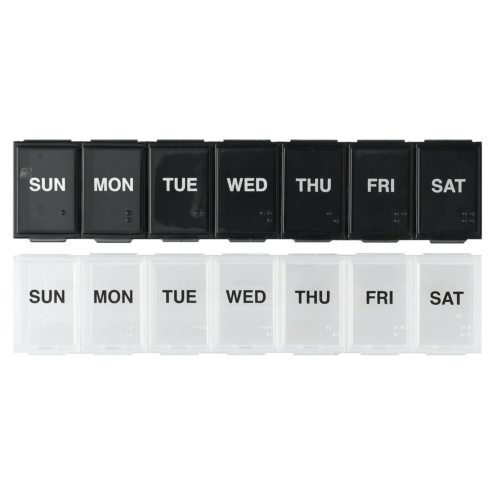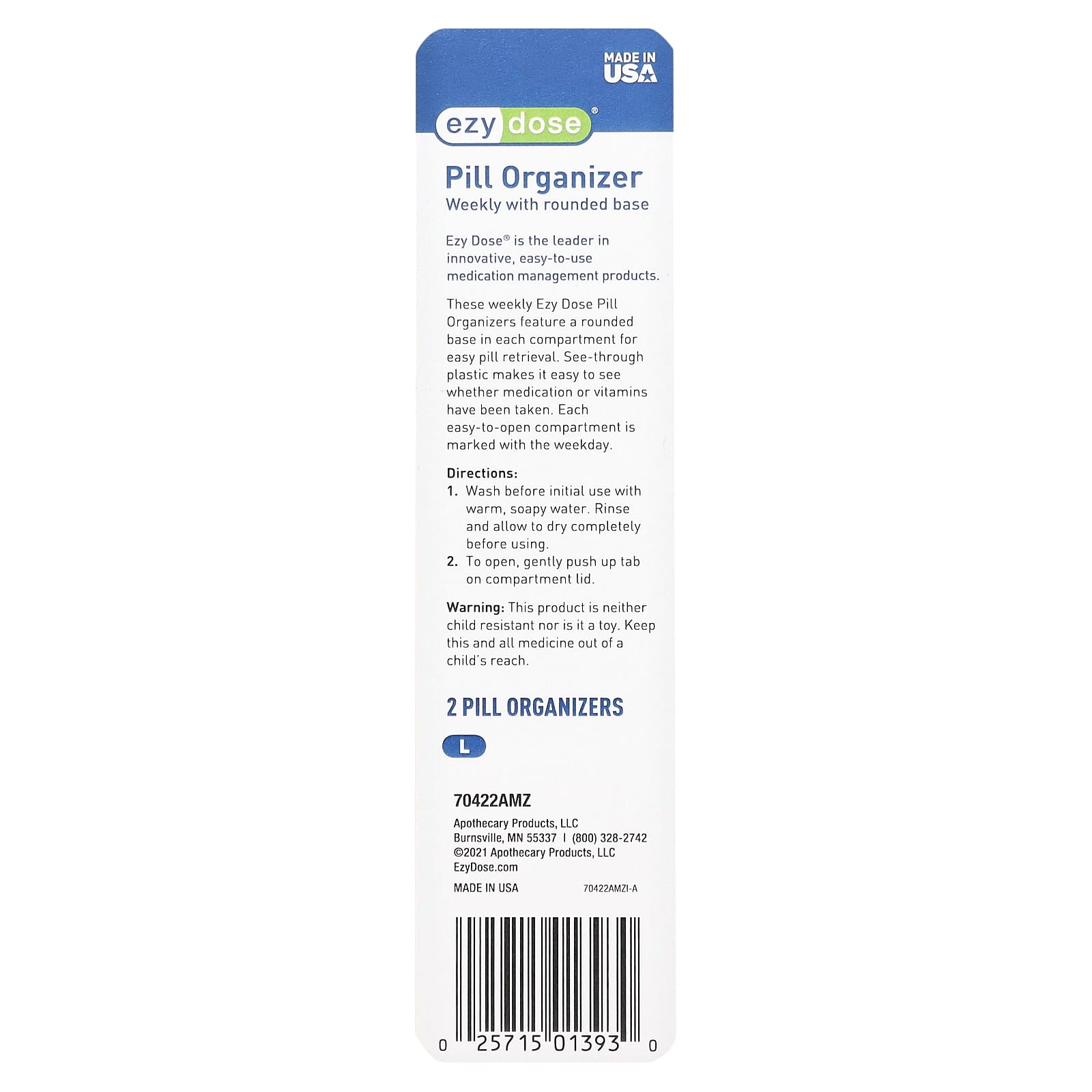 Эти еженедельные органайзеры для таблеток Ezy Dose имеют закругленное основание в каждом отделении для удобного извлечения таблеток. Прозрачный пластик позволяет легко увидеть, были ли приемы лекарств или витаминов. На каждом легкодоступном отделении указан день недели.