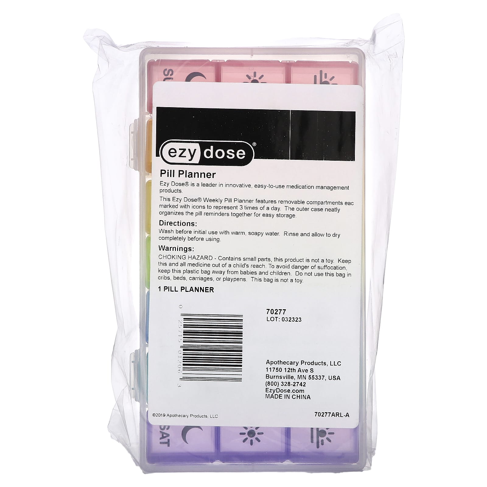 Этот ежедневник Ezy Dose® имеет съемные отделения, каждое из которых помечено значком, обозначающим 3 раза в день. Во внешнем футляре напоминания аккуратно собраны вместе для удобного хранения.