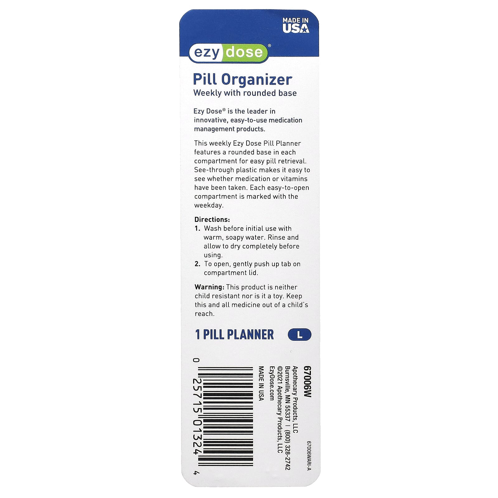 Этот еженедельный органайзер для таблеток Ezy Dose имеет закругленное основание в каждом отделении для удобного извлечения таблеток. Прозрачный пластик позволяет легко увидеть, были ли приемы лекарств или витаминов. На каждом легкодоступном отделении указан день недели.