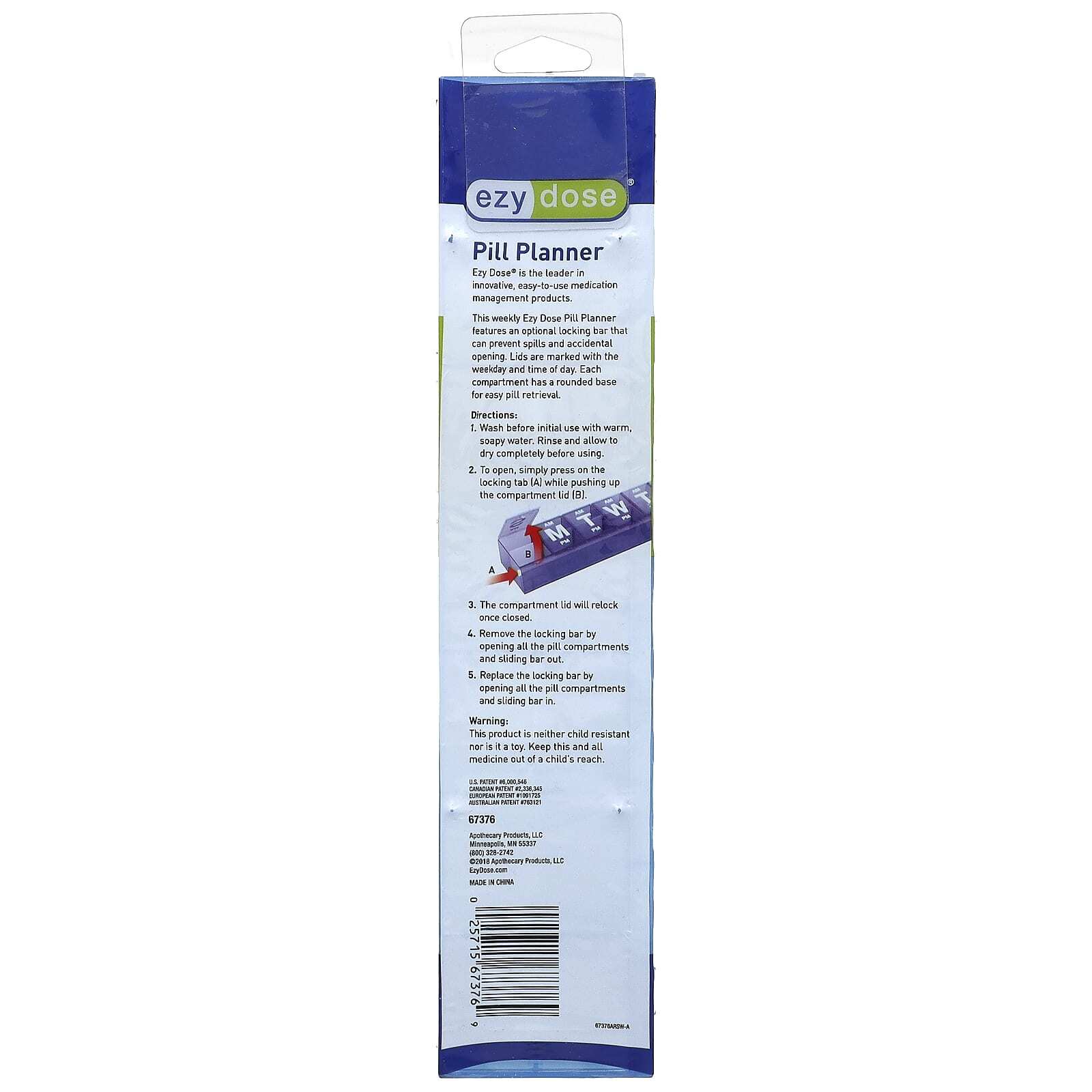Этот еженедельный органайзер для таблеток Ezy Dose имеет дополнительную планку с замком, которая может предотвратить проливание и случайное открытие. На крышке указаны день недели и время суток. Каждое отделение имеет закругленное дно для легкого извлечения таблеток.
