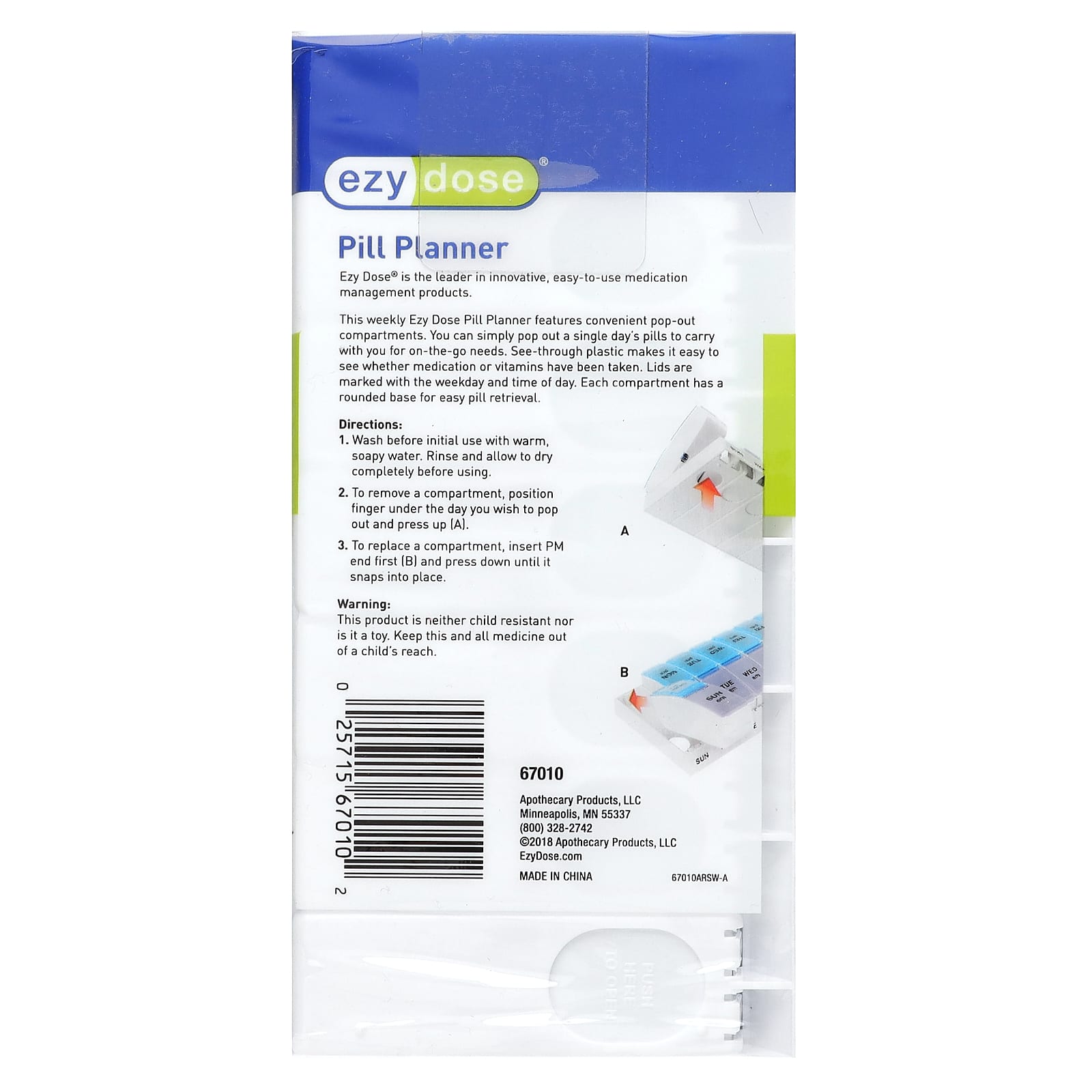 Еженедельный органайзер для таблеток Ezy Dose имеет удобные выдвижные отделения. Вы можете просто взять с собой одноразовую таблетку, чтобы взять ее с собой в любое время. Прозрачный пластик позволяет легко увидеть, были ли приемы лекарств или витаминов. На крышке указаны день недели и время суток. Каждое отделение имеет закругленное дно для легкого извлечения таблеток.