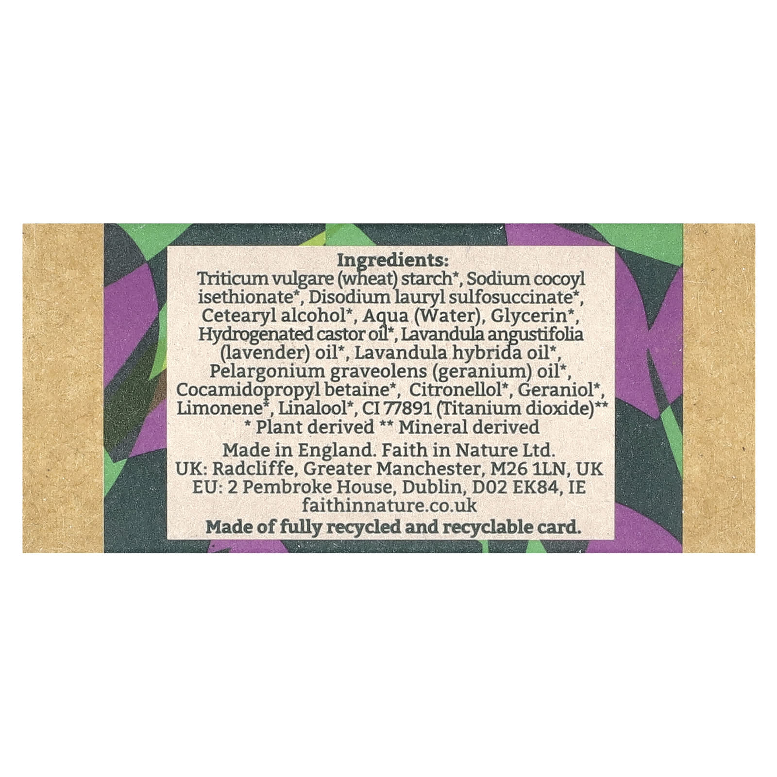 Крахмал Triticum vulgare (пшеничный) *, кокоилизетионат натрия *, динатрий лаурилсульфосукцинат цетеариловый спирт *, вода (Aqua), глицерин гидрогенизированное касторовое масло *, масло лаванды (Lavandula angustifolia) *, масло герани (Lavandula hybrida), масло герани (Pelargonium graveolens), кокамидопропил бетаин *, цитронеллол *, гераниол * лимонен *, линалоол *, CI 77891 (диоксид титана).