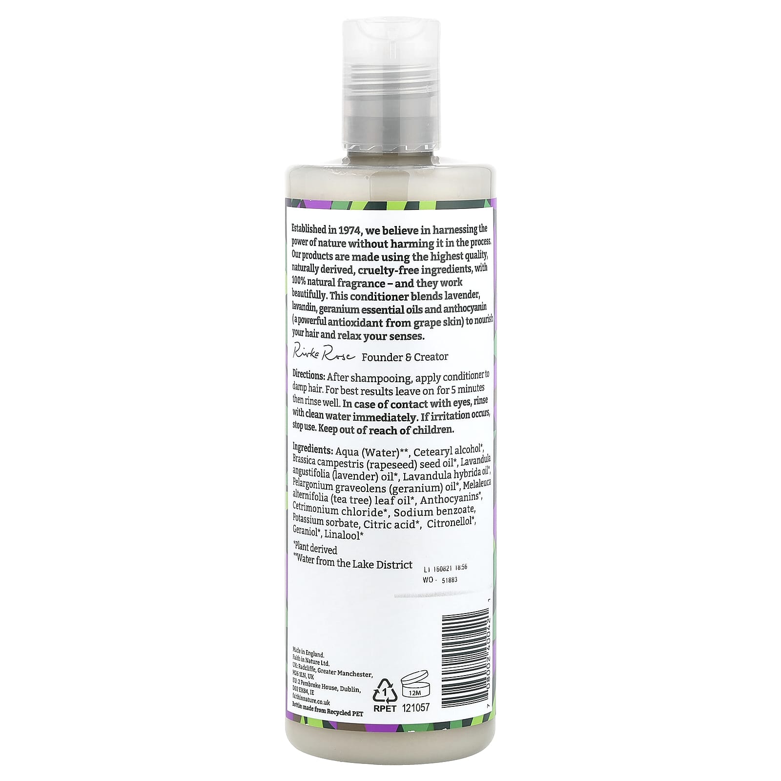 Основанная в 1974 году, мы используем силу природы, не причиняя ей вреда. Наши продукты изготовлены из натуральных ингредиентов высочайшего качества, без применения жестоких методов, со 100% натуральным ароматом и прекрасно работают. Этот кондиционер содержит эфирные масла лаванды, лавандина, герани и антоциан (мощный антиоксидант из виноградной кожицы), которые питают ваши волосы и расслабляют ваши чувства.