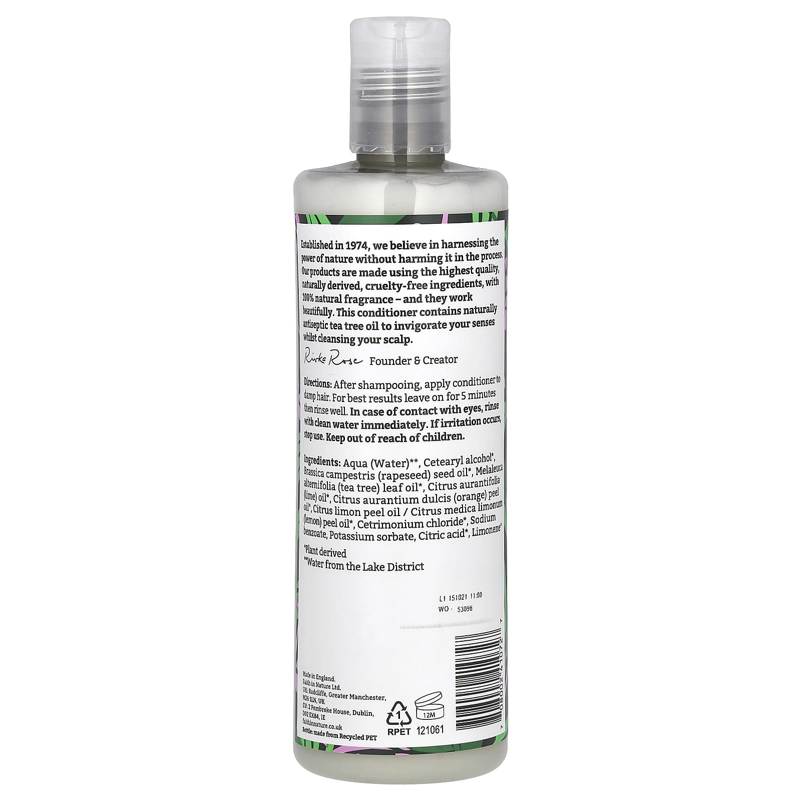 Основанная в 1974 году, мы используем силу природы, не причиняя ей вреда. Наши продукты изготовлены из натуральных ингредиентов высочайшего качества, без применения жестоких методов, со 100% натуральным ароматом и прекрасно работают. Этот кондиционер содержит натуральное антисептическое масло чайного дерева, которое бодрит и очищает кожу головы.