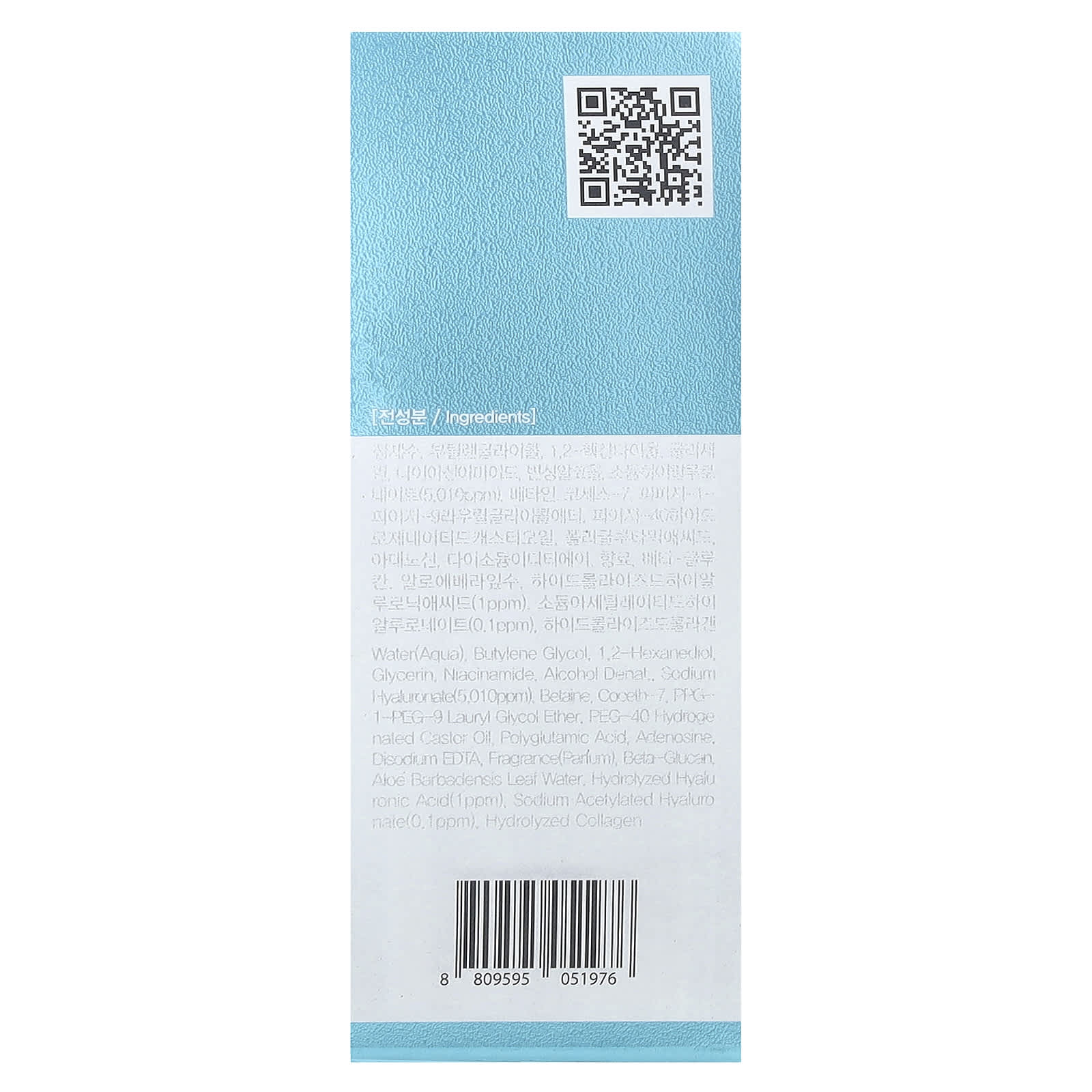 Вода, бутиленгликоль, 1,2-гександиол, глицерин, никотинамид, денатурированный спирт, гиалуронат натрия (5,010 част. / млн), бетаин, коцет-7, ППГ-1-ПЭГ-9 лаурилгликоль эфир, вода из листьев алоэ вера, ПЭГ-40 гидрогенизированное касторовое масло, полиглутаминовая кислота, аденозин, двунатриевая ЭДТК, аромат, бета-глюкан, бутилфенил метилпропиональ, линалоол, альфа-изометилионон, гидролизованный коллаген, гидролизованная гиалуроновая кислота (1 част. / млн), ацетилированный гиалуронат натрия (0,1 част. / млн).