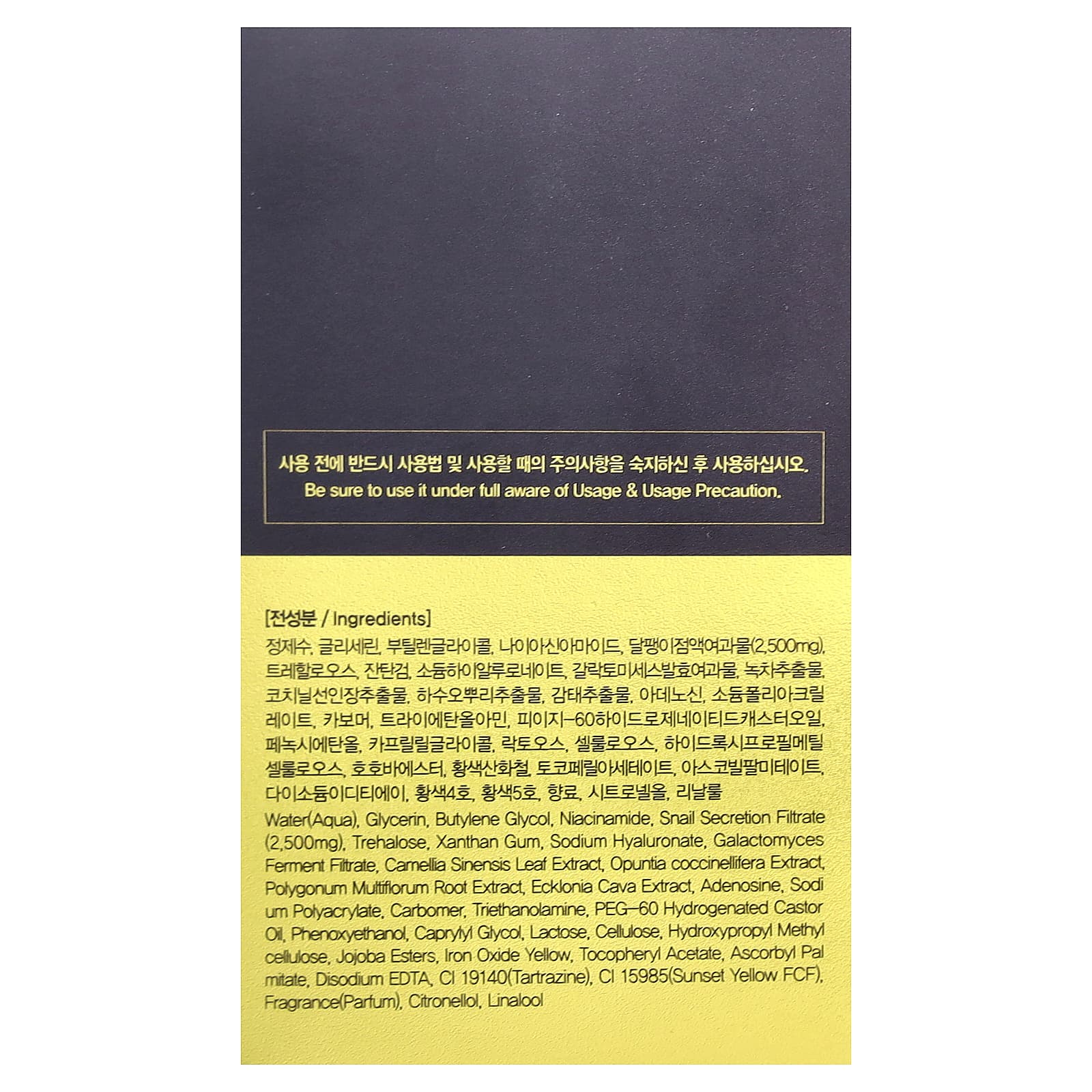 Вода, глицерин, бутиленгликоль, никотинамид, фильтрат секрета улитки (2.500 мг), трегалоза, ксантановая камедь, гиалуронат натрия, ферментированный фильтрат галактомицетов (Galactomyces), экстракт листьев зеленого чая (Camellia sinensis), опунция кокцинеллифера, экстракт корня горца многоцветкового (Polygonum multiflorum), экстракт эклонии кавы (Ecklonia cava), аденозин, полиакрилат натрия, карбомер, триэтаноламин, ПЭГ-60 гидрогенизированное касторовое масло, феноксиэтанол, каприлилгликоль, двунатриевая ЭДТК, отдушка, CI 19140, CI 15985.