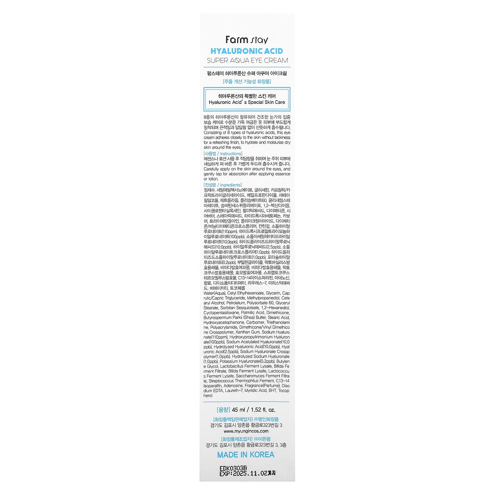Вода, цетилэтилгексаноат, глицерин, каприловый/каприновый триглицерид, метилпропандиол, цетеариловый спирт, вазелин, полисорбат 60, глицерил стеарат, сорбитана сесквиолеат, 1,2-гександиол, циклопентасилоксан, пальмитиновая кислота, диметикон, масло ши (Butyrospermum parkii), стеариновая кислота, гидроксиацетофенон, карбомер, триэтаноламин, полиакриламид, диметикон/винил диметикон кроссполимер, ксантановая камедь, гиалуронат натрия (110 част./млн), гидроксипропилтримония гиалуронат (100 част. / млрд), ацетилированный гиалуронат натрия (10,0 част. / млрд), гидролизованная гиалуроновая кислота (10,0 част. / млрд), гиалуроновая кислота (2,5 част. / млрд), кроссполимер гиалуроната натрия (1,0 част. / млрд), гидролизованный гиалуронат натрия (1,0 част. / млрд), гиалуронат калия (0,2 част. / млрд), бутиленгликоль, лизат фермента молочнокислых бактерий (Lactobacillus), продукт ферментации бифидобактерий, лизат ферментов бифидобактерий, лизат ферментов лактококка, продукт ферментации дрожжевых грибков-сахаромицетов, фермент Streptococcus thermophilus, c13-14 изопарафин, аденозин, отдушки, двунатриевая ЭДТК, лаурет-7, миристиновая кислота, бутилгидрокситолуол, токоферол.