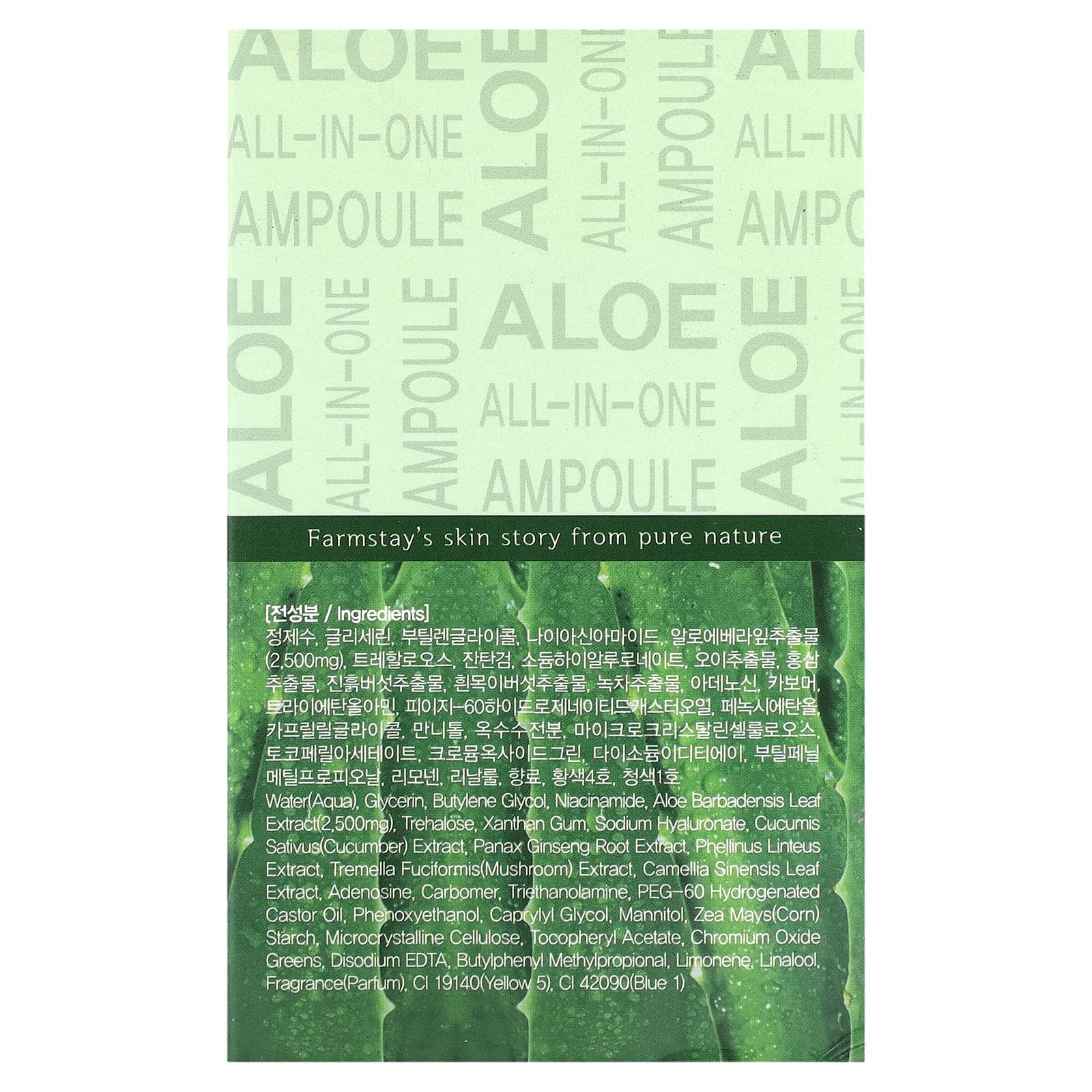 Вода (Aqua), глицерин, бутиленгликоль, никотинамид, экстракт листьев алоэ вера (Aloe barbadensis) (2500 мг), трегалоза, ксантановая камедь, гиалуронат натрия, экстракт огурца (Cucumis sativus), экстракт корня женьшеня (Panax ginseng), экстракт санхвана (Phellinus linteus), экстракт снежного гриба (Tremella fuciformis), экстракт листьев зеленого чая (Camellia sinensis), аденозин, карбомер, триэтаноламин, ПЭГ-60 гидрогенизированное касторовое масло, феноксиэтанол, каприлилгликоль, маннит, кукурузный крахмал (Zea mays), микрокристаллическая целлюлоза, токоферилацетат, хромовая зелень, двунатриевая ЭДТК, бутилфенил метилпропиональ, лимонен, линалоол, отдушка (парфюмерная композиция), краситель желтый 5 (CI 19140), краситель синий 1 (CI 42090).