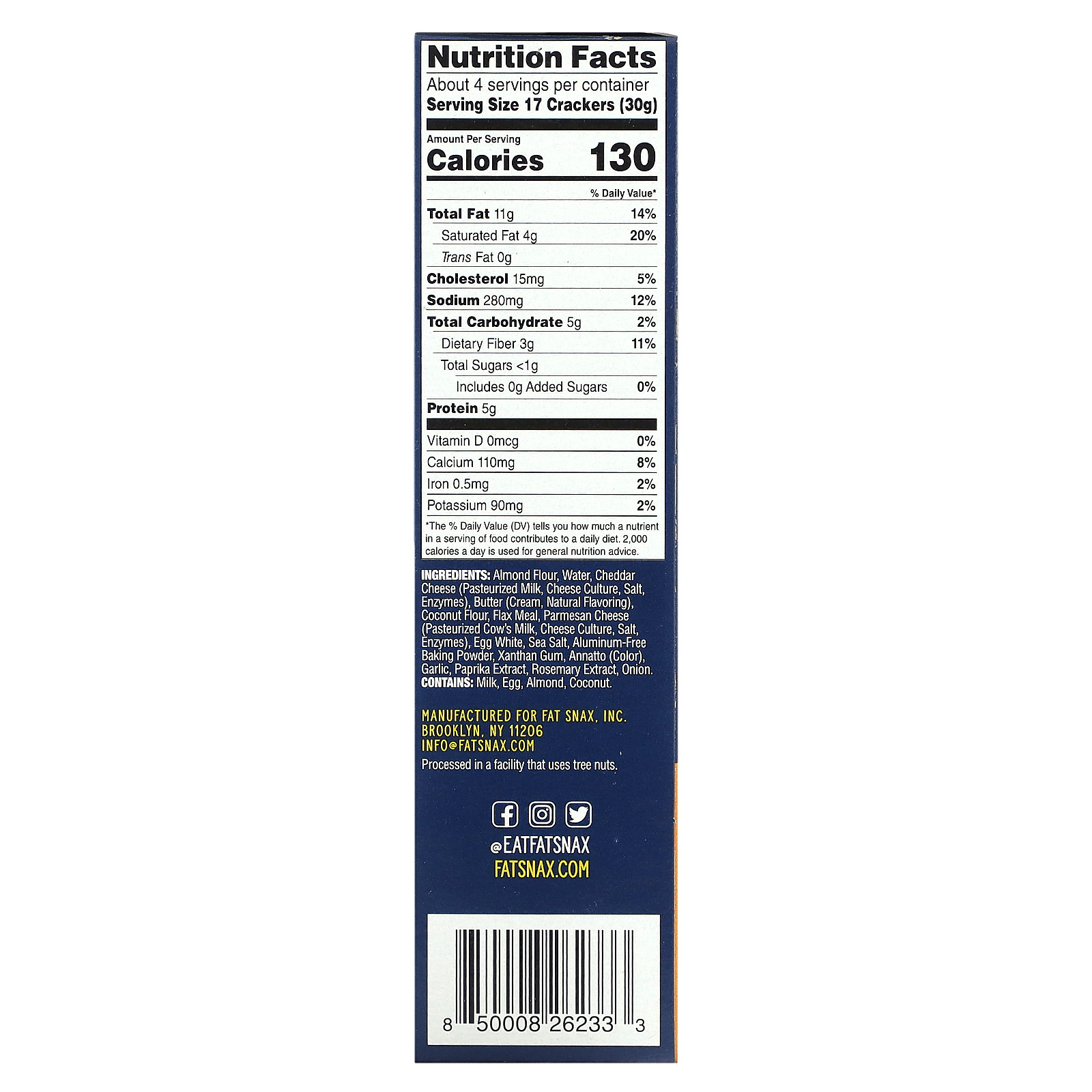 Миндальная мука, яичный белок, сыр чеддер [кисломолочный, соль, ферменты, аннато (цвет)], масло (сливки), кокосовая мука, семена льна, сыр пармезан (кисломолочный, ферменты, соль), разрыхлитель без алюминия, вода, ксантановая камедь, морская соль, аннато (цвет), паприка, чеснок, розмарин, лук.