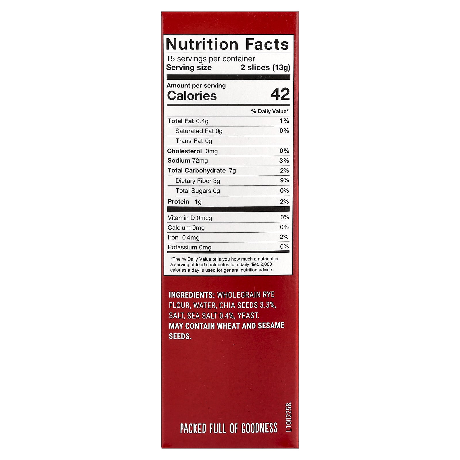 Цельнозерновая ржаная мука, вода, семена чиа — 3,3%, соль, морская соль 0,4%, дрожжей.