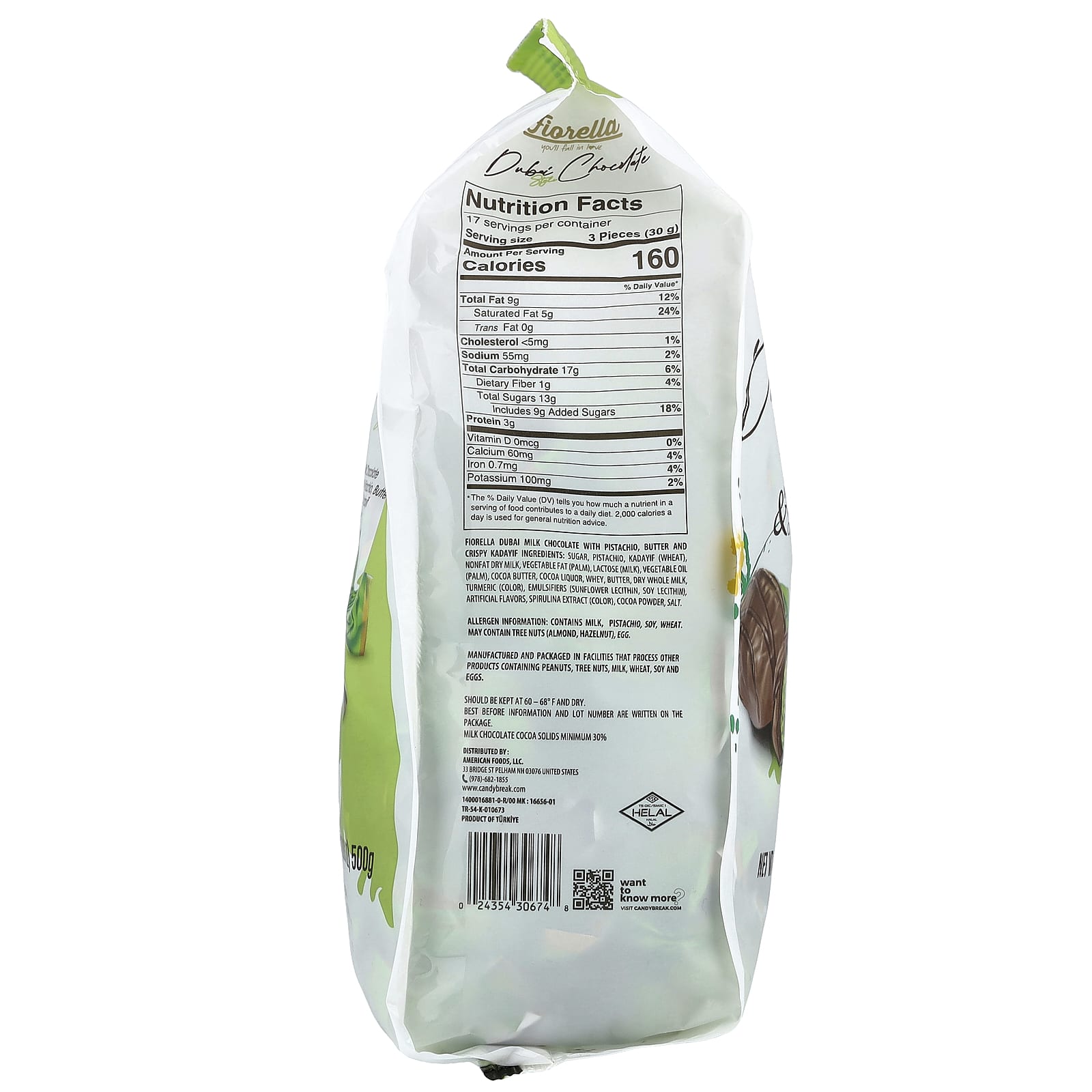 Сахар, фисташки, кадаиф (пшеница), обезжиренное сухое молоко, растительный жир (пальмовый), лактозы (молоко), растительное масло (пальмовое), какао-масло, тертое какао, сыворотка, сливочное масло, сухое цельное молоко, куркума (краситель), эмульгаторы (подсолнечный лецитин, соевый лецитин), искусственных ароматизаторов, экстракт спирулины (краситель), какао-порошок, соль.