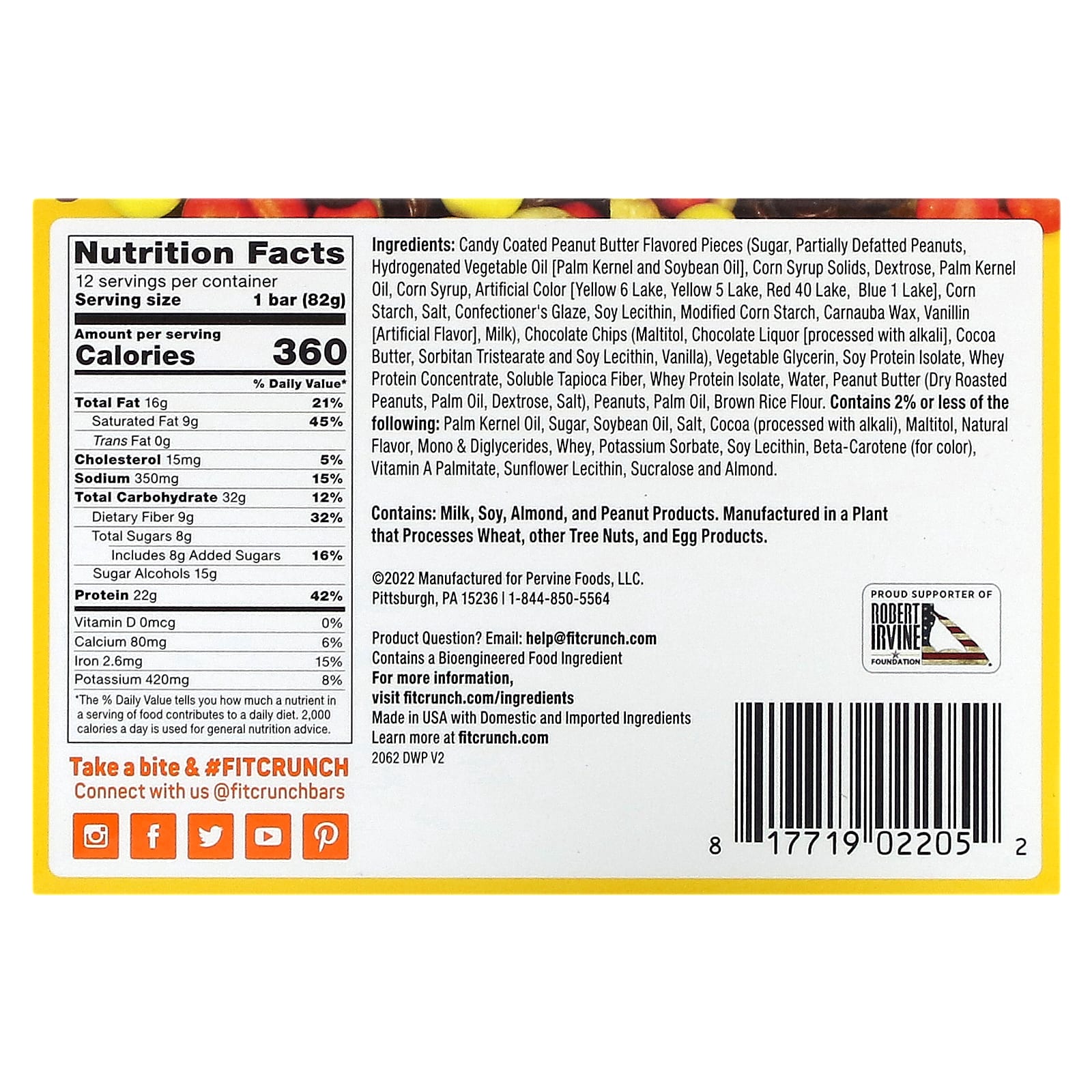 Конфеты со вкусом арахисовой пасты (сахар, частично обезжиренный арахис, гидрогенизированное растительное масло [пальмоядровое и соевое масло], сухая кукурузная патока, декстроза, пальмоядровое масло, кукурузный сироп, искусственный краситель [желтый 6 озер, краситель желтый 5 лак, краситель красный 40 лак, краситель синий 1 лак], кукурузный крахмал, соль, кондитерская глазурь, лецитин из сои, модифицированный кукурузный крахмал, карнаубский воск, ванилин [искусственный ароматизатор], молоко), шоколадная крошка [мальтит, шоколадный ликер [обработанный щелочью], какао-масло, сорбитан тристеарат и соевый лецитин, ваниль), растительный глицерин, изолят соевого белка, концентрат сывороточного протеина, растворимая тапиоковая клетчатка, изолят сывороточного протеина, вода, арахисовая паста (арахис, пальмовое масло, декстроза, соль), арахис, пальмовое масло, мука из коричневого риса. содержит не более 2% следующих ингредиентов: косточковое пальмовое масло., сахар, соевое масло, соль, какао (обработанное щелочью), мальтит, натуральный ароматизатор, моно- и диглицериды, сыворотка, сорбат калия, лецитин из сои, бета-каротин (краситель), пальмитат витамина A, подсолнечный лецитин, сукралоза и миндаль.