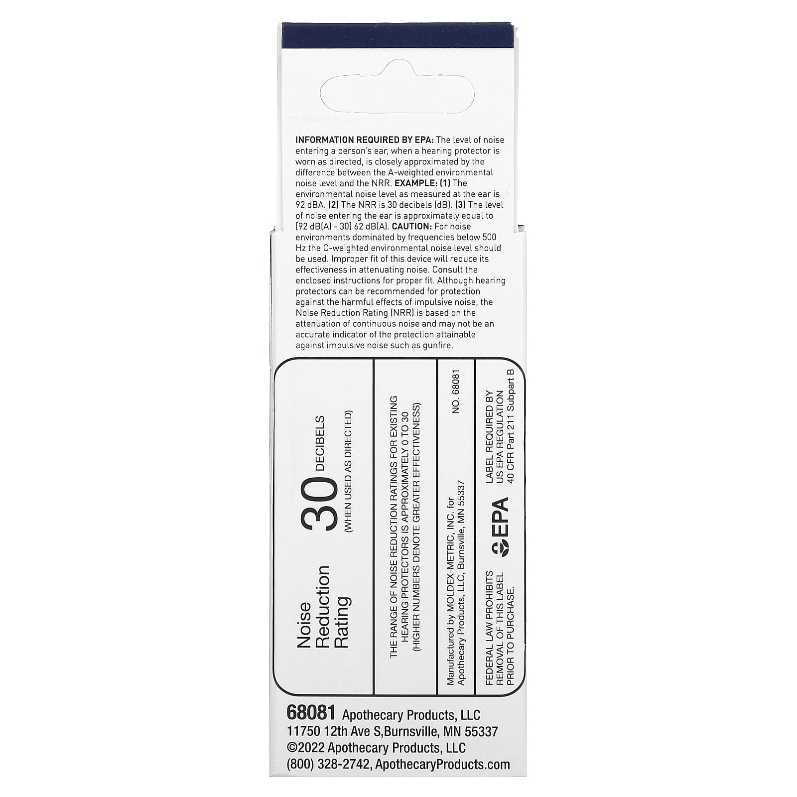 Информация, требуемая EPA: Уровень Шума, попадающего в ухо человека при носимом в соответствии с рекомендациями средстве для защиты органов слуха, приблизительно соответствует разности между уровнем окружающего Шума и NRR.