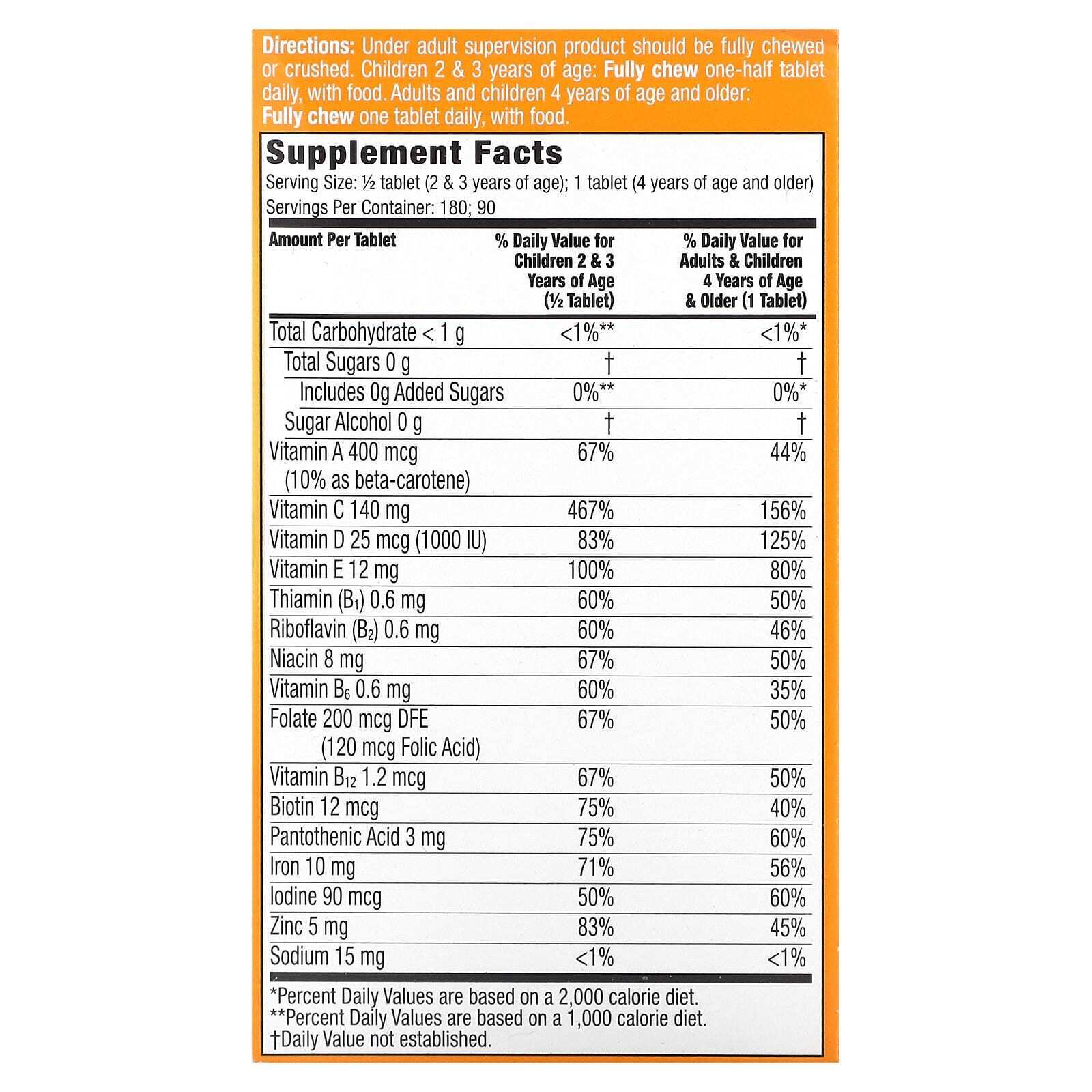 ацетат, стеариновая кислота, модифицированный пищевой крахмал, лимонная кислота; менее 2%: бета-каротин, биотин, краситель (экстракт аннато [семена], сок красной свеклы, сок красного батата, экстракт спирулины, олеорезин куркумы), d-пантотенат кальция, фолиевая кислота, желатина, молочная кислота, стеарат магния, натуральный ароматизатор, никотинамид, йодид калия, пиридоксина гидрохлорид, рибофлавин, диоксид кремния, сукралоза, тиамина мононитрат, ацетат витамина A, витамин B12 (цианокобаламин), витамин D3 (холекальциферол), оксид цинка.