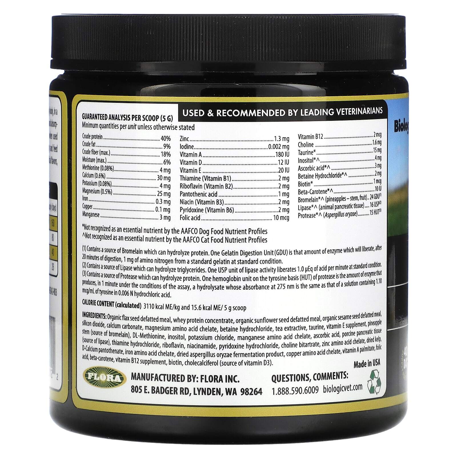 Шрот обезжиренный из органических семян льна, концентрат сывороточного протеина, органический обезжиренный шрот, органическая обезжиренная мука из семян кунжута, диоксид кремния, карбонат кальция, аминокислотный хелат магния, бетаина гидрохлорид, экстракт чая, таурин, добавленный витамин Е, стебель ананаса (источник бромелаина), DL-метионин, инозитол, хлорид калия, аминокислотный хелат марганца, аскорбиновая кислота, ткань поджелудочной железы свиньи (источник липазы), тиамина гидрохлорид, рибофлавин, никотинамид, пиридоксина гидрохлорид, битартрат холина, аминокислотный хелат цинка, сушеные водоросли, D-пантотенат кальция, аминокислотный хелат железа, сухой продукт ферментации аспергилла (Aspergillus oryzae), хелат аминокислоты меди, пальмитат витамина A, фолиевая кислота, бета-каротин, добавленный витамин В12, биотин, холекальциферол (источник витамина D3).