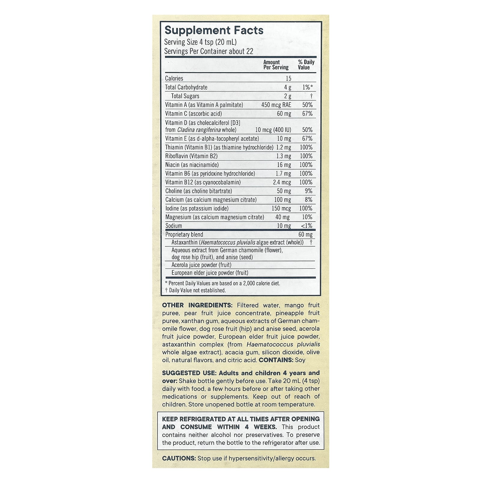 Взрослым и детям старше 4 лет: Аккуратно встряхните флакон перед использованием. Принимать по 20 мл (4 ч. л.) в день во время еды, за несколько часов до или после приема других препаратов или добавок. Хранить в недоступном для детей месте. Хранить закрытый флакон при комнатной температуре.