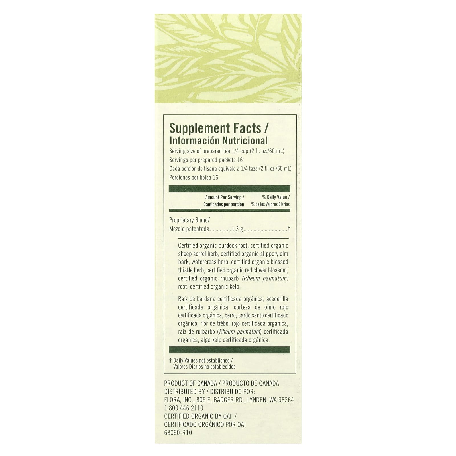 | Патентованная смесь Корень сертифицированного органического лопуха, сертифицированный органический щавель воробьиный, кора сертифицированного органического вяза ржавого, кресс водяной, сертифицированный органический кникус благословенный, цветки сертифицированного органического красного клевера, корень сертифицированного органического ревеня (Rheum palmatum), сертифицированные органические бурые водоросли. | 1,3 г | † |