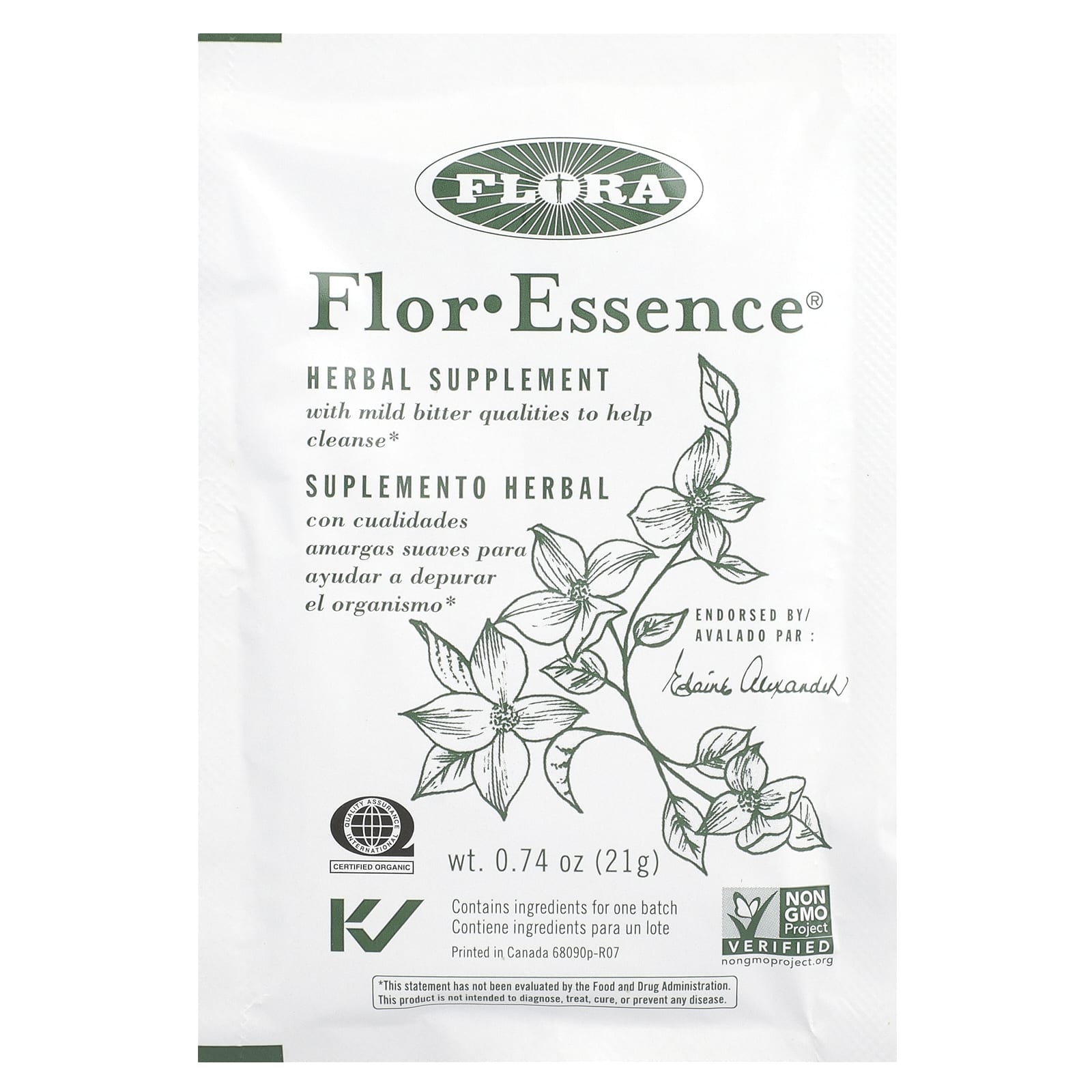 Элейн Александер, покойный канадский исследователь в области здравоохранения, радиопродюсер и телеведущая, эксклюзивно сотрудничала с Flora для производства Flor • Essence®. Этот очищающий чай был доверен Элейн доктором Чарльз Бруш, доктор медицины, личный врач покойного президента Джона Ф. Кеннеди. Доктор Бруш был партнером по исследованиям и совладельцем известной канадской медсестры Рене Кайссе, совершенствуя эту формулу в своей клинике в Кембридже, штат Массачусетс. Flor • Essence® - единственный продукт на рынке, на упаковке которого есть подпись Элейн, подтверждающая его историческую подлинность.