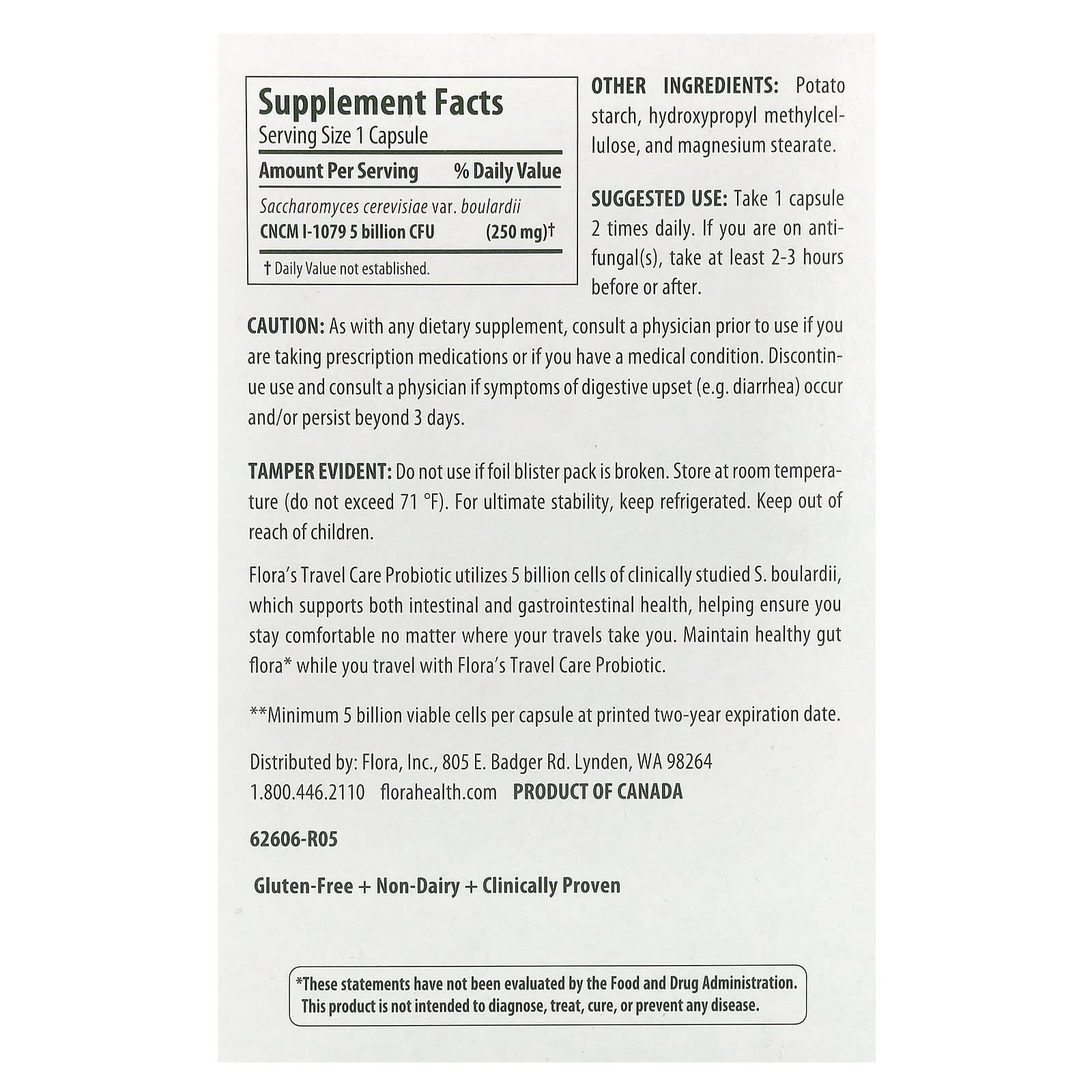Flora's Travel Care использует 5 миллиардов клеток клинически изученного S. boulardii, который поддерживает здоровье кишечника и желудочно-кишечного тракта, помогая вам чувствовать себя комфортно, куда бы вы ни отправились. Поддерживайте здоровую кишечную флору во время путешествий с помощью пробиотика Flora Travel Care.