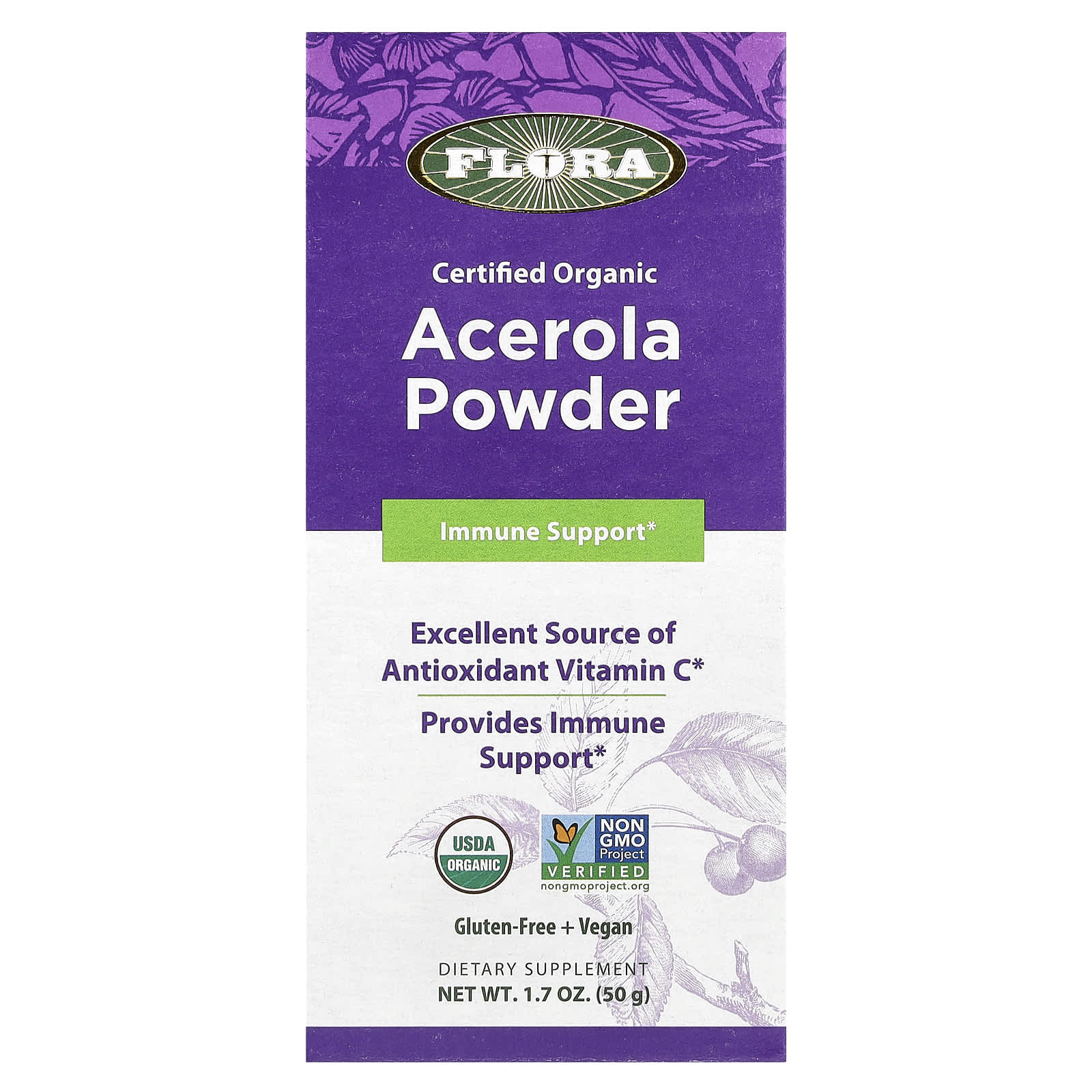 Вишня ацерола содержит натуральный витамин С, который обладает антиоксидантными свойствами и помогает поддерживать здоровье иммунной системы. Вишня ацерола — богатейший растительный источник витамина C, содержащий в 16 раз больше витамина C, чем апельсины. Порошок ацеролы премиального качества от Flora — это порошок из чистого сока, отжатый из органически выращенной ацеролы и высушенный при низкой температуре, чтобы сохранить спектр мощных питательных веществ плодов.