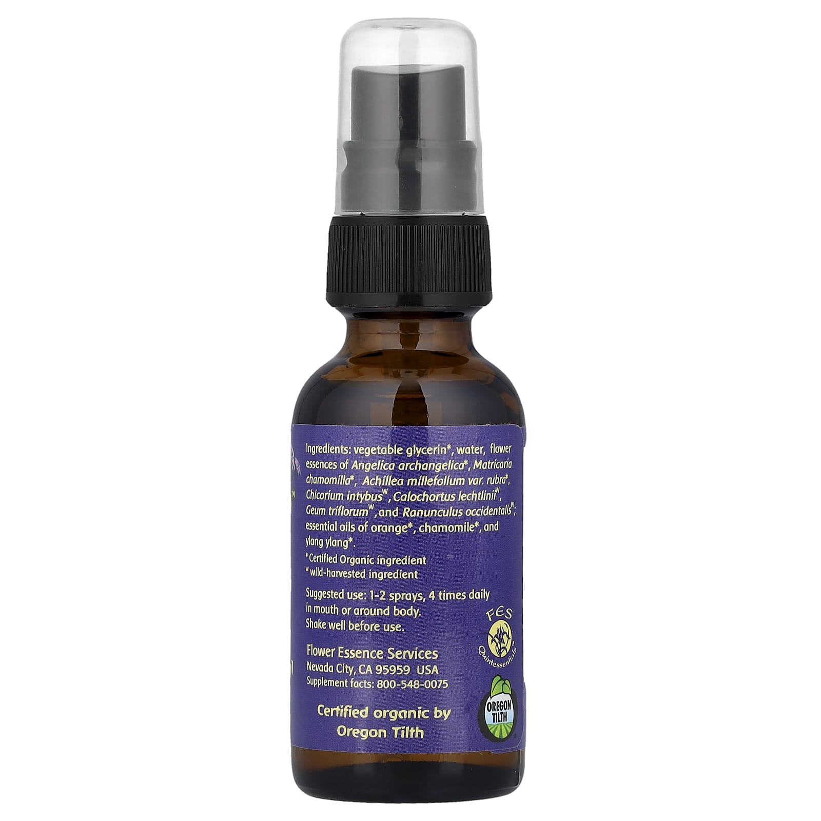 Растительный глицерин*, вода, цветочные эссенции дудника архангелики *, Ромашка ромашка *, Achillea millefolium var. rubra *, Цикорий обыкновенный (Chicorium intybusw), Калохортус (Calochortus lechtliniiw), Геум трифлорумв, и ранункулус западный; эфирные масла апельсина *, chamomile*, и иланг-иланг *.