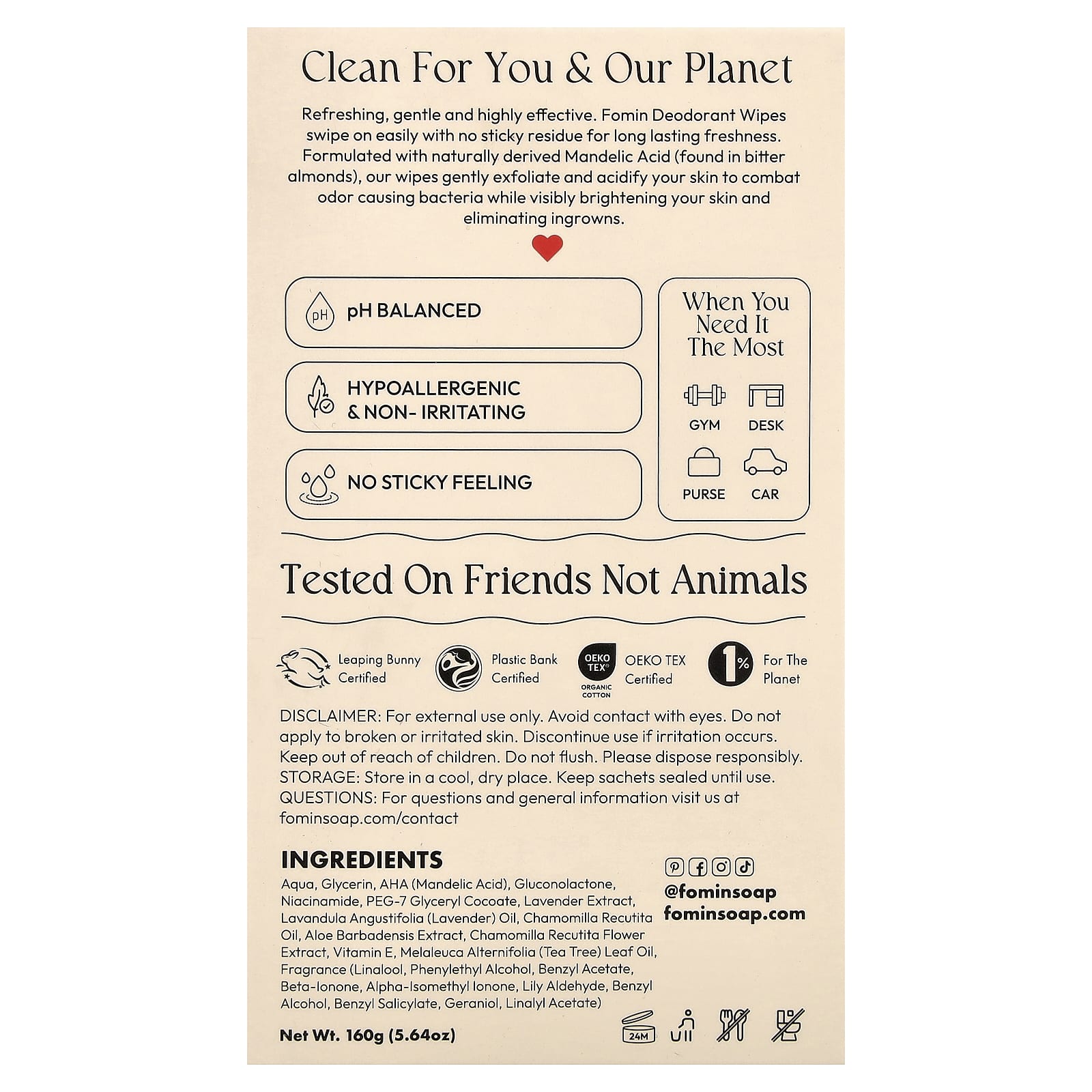 Освежающий, мягкий и высокоэффективный. Дезодорант-салфетки Fomin легко наносится, не оставляя липкости, и обеспечивает свежесть надолго. Наши салфетки, созданные на основе миндальной кислоты природного происхождения (полученной из горького миндаля), мягко отшелушивают и подкисляют кожу, борясь с бактериями, вызывающими неприятный запах, а также заметно осветляя кожу и устраняя вросшие.